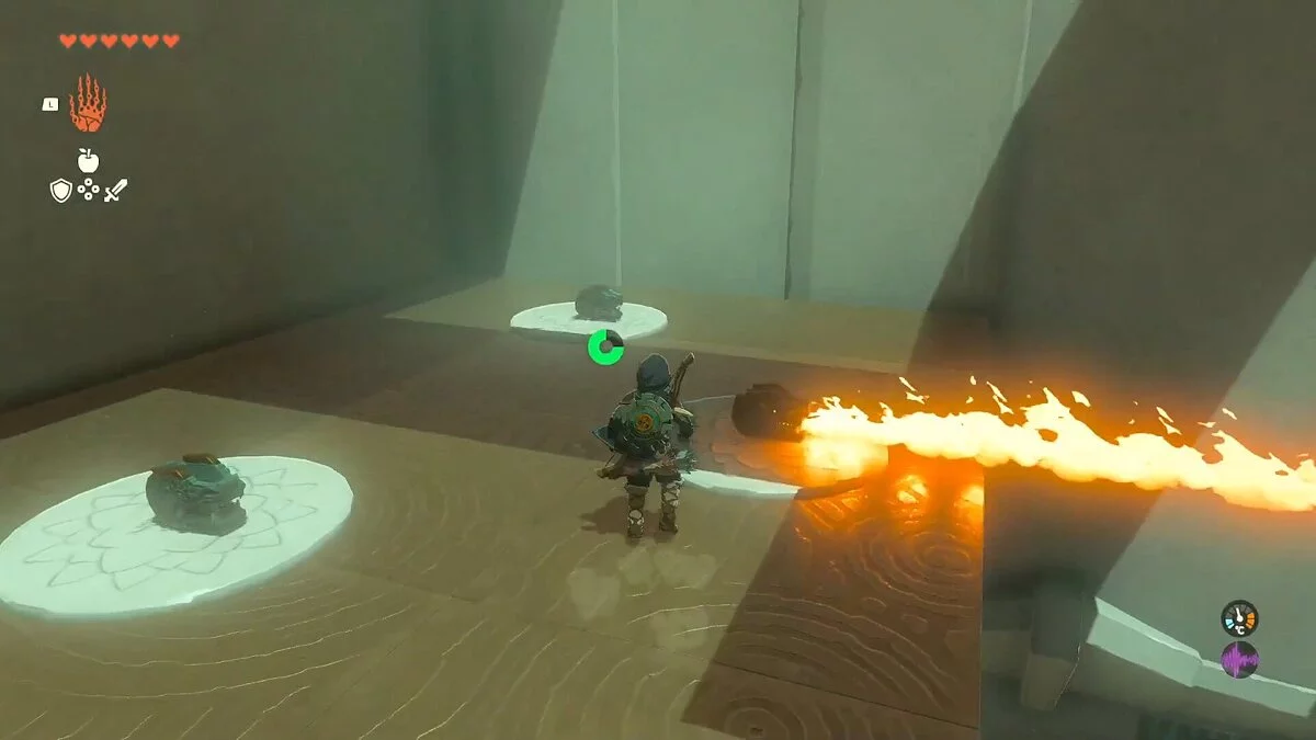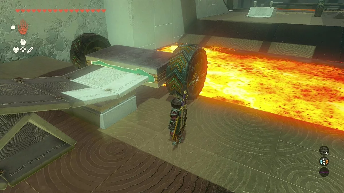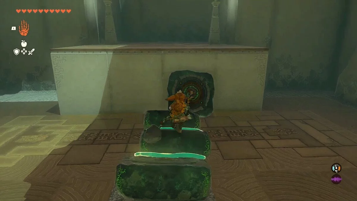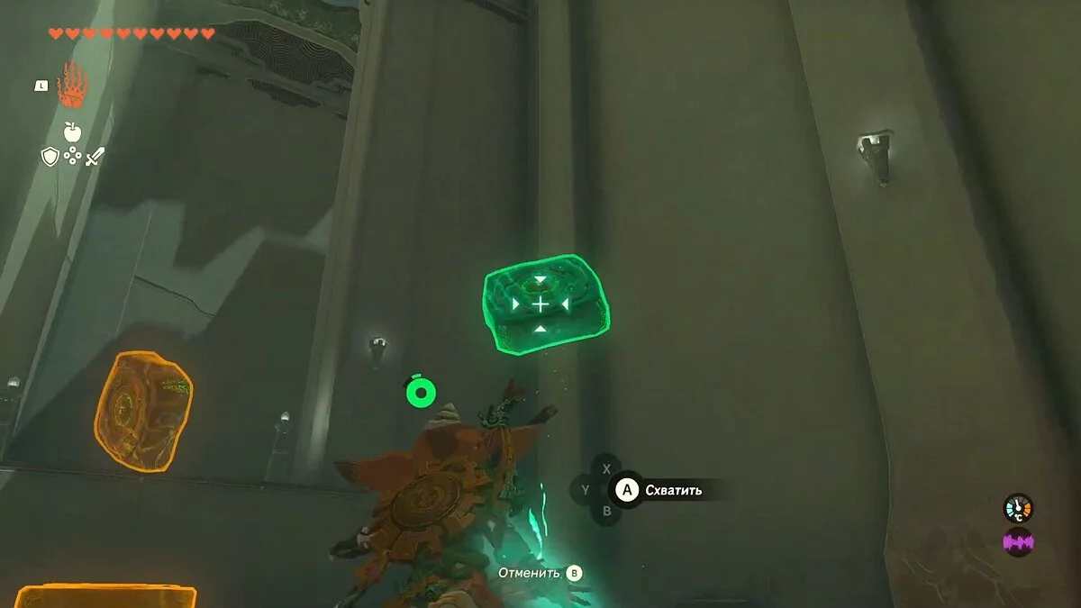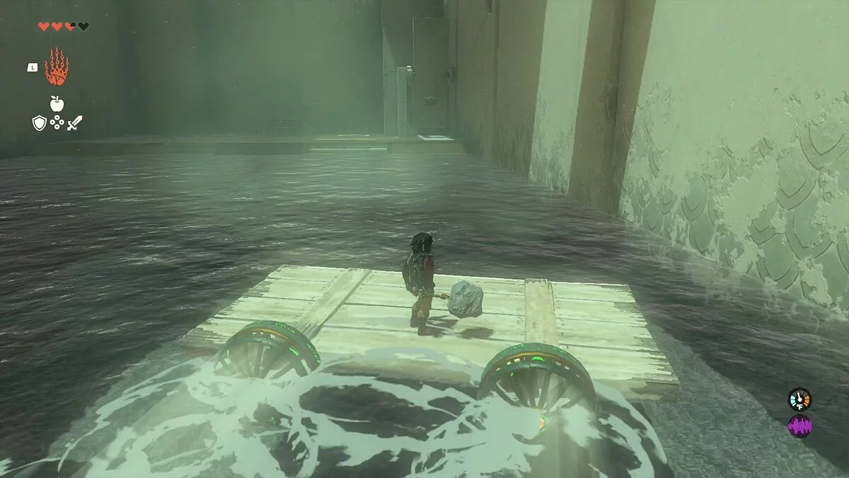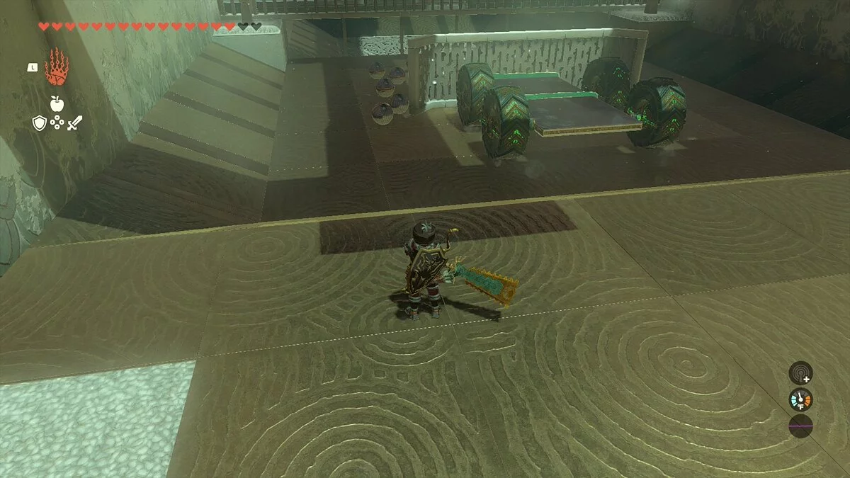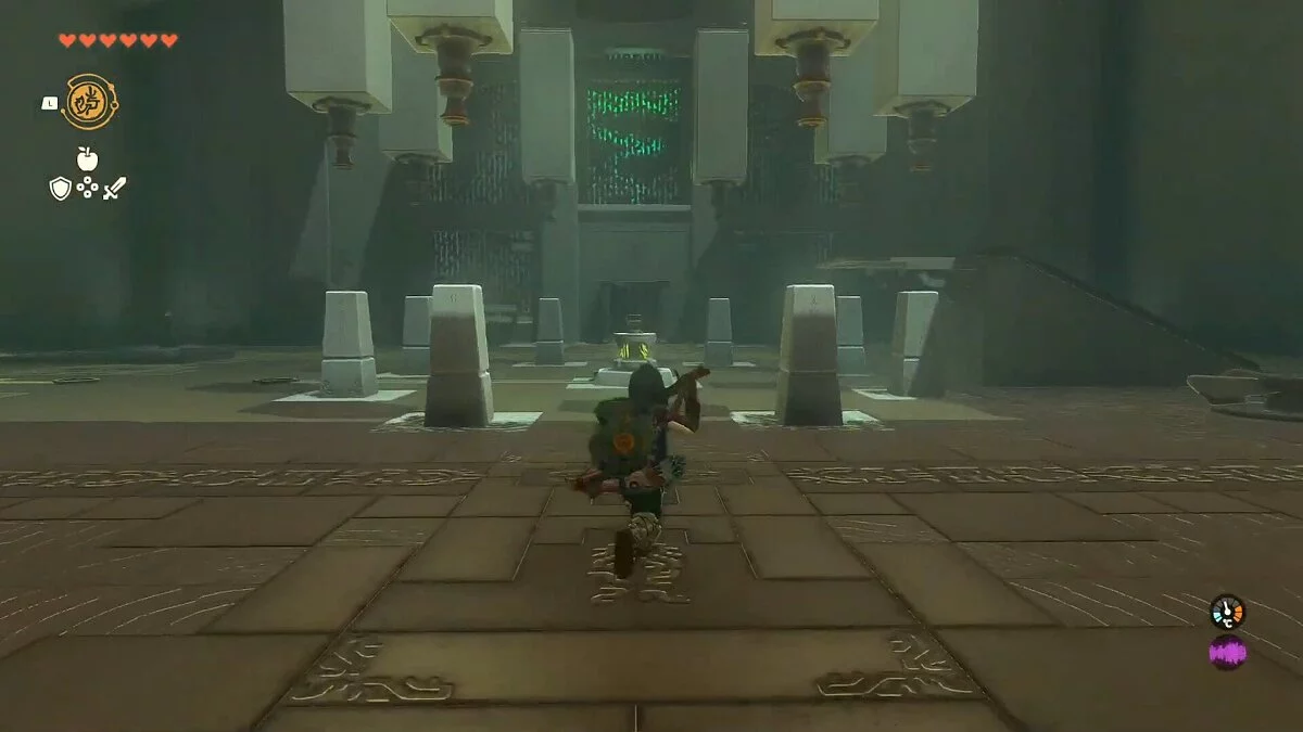 Поднимитесь на платформе на следующий этаж и поместите шар в отверстие. Используйте планер на недавно опущенные ворота. Поскольку вам больше не нужно, чтобы эти ворота были открыты, возьмите сферу еще раз с помощью Комбикинеза и прикрепите её к планеру. Поместите планер на рельсы, ведущие от платформы, запрыгните на планер и ударьте по вентиляторам, чтобы вернуть Линка и сферу обратно ко входу в храм.