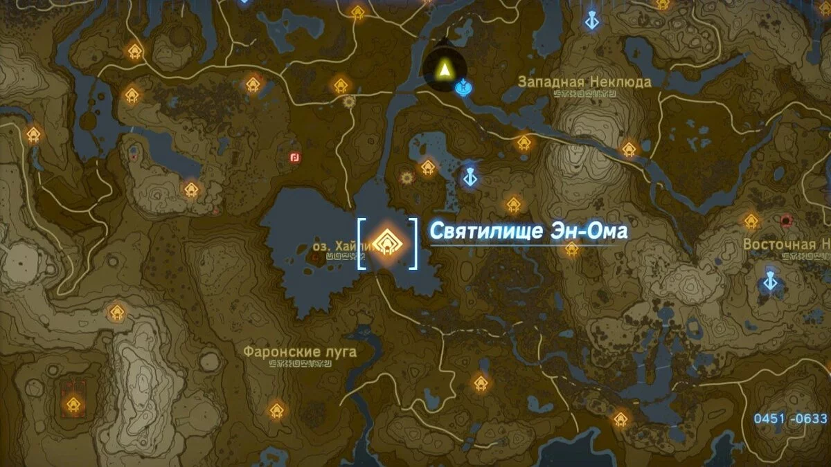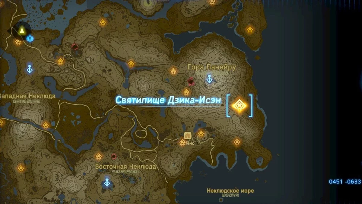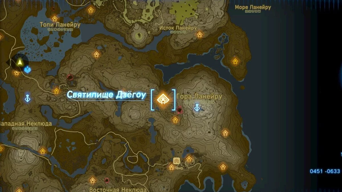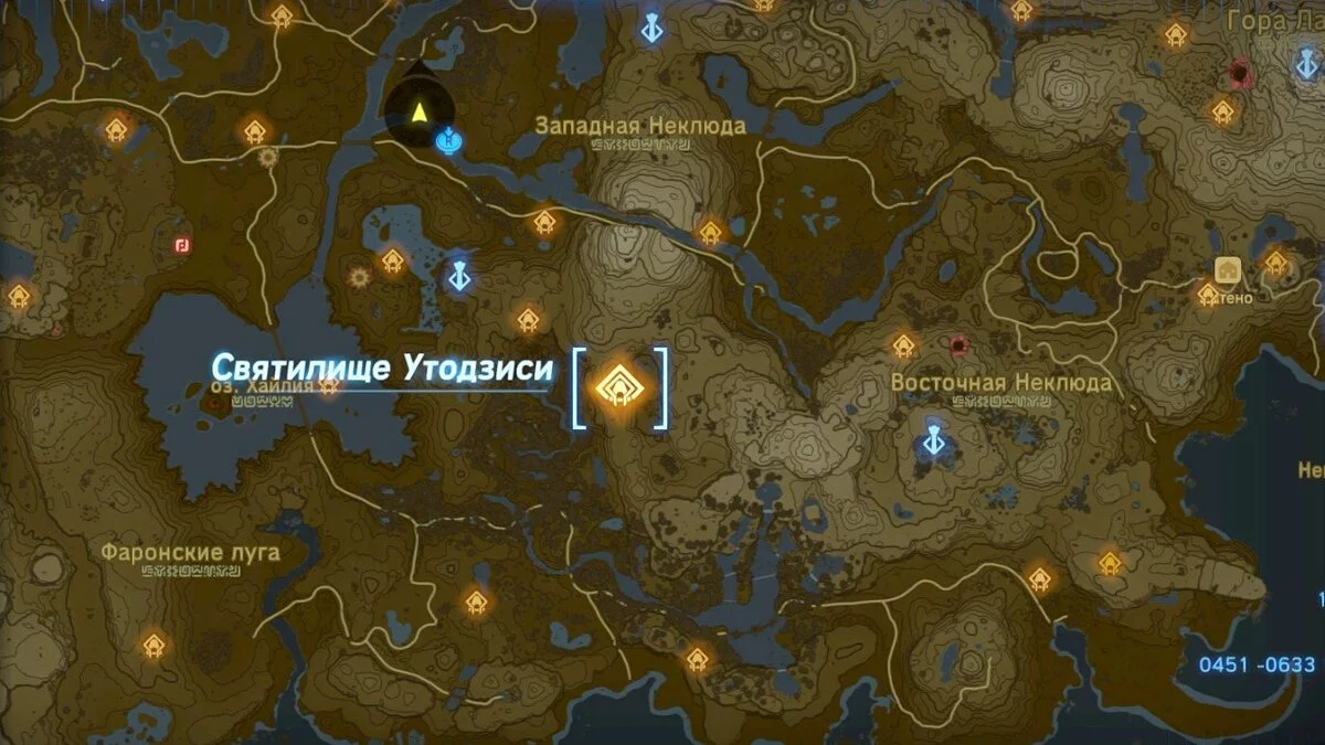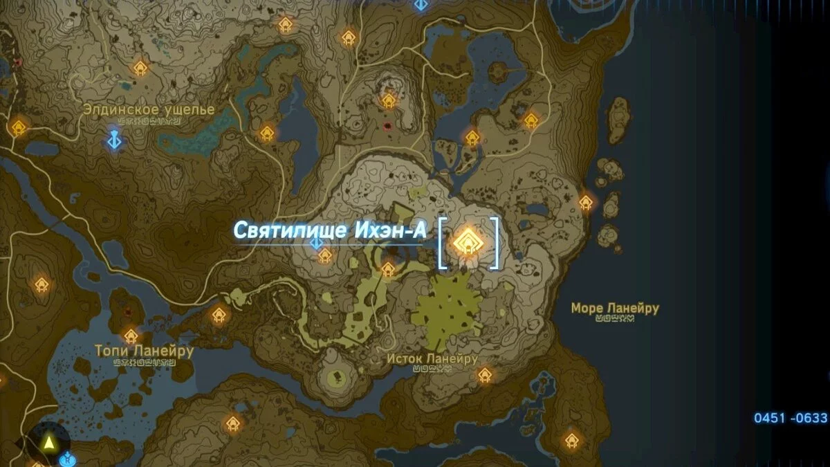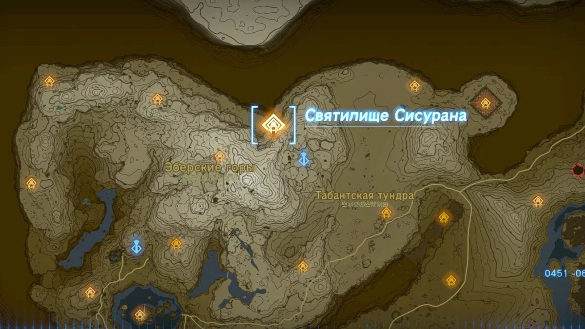 - Местонахождение: Святилище расположено к юго-западу от конюшни «Снежная» . Спрятан в пещере «Азанские насосы». Вход в пещеру находится в южной части «Южной тундры». Войдя в пещеру, Линк должен пересечь ледяную воду;