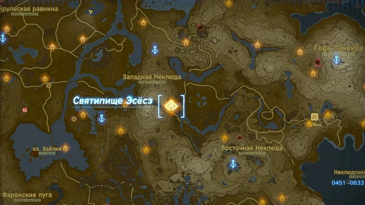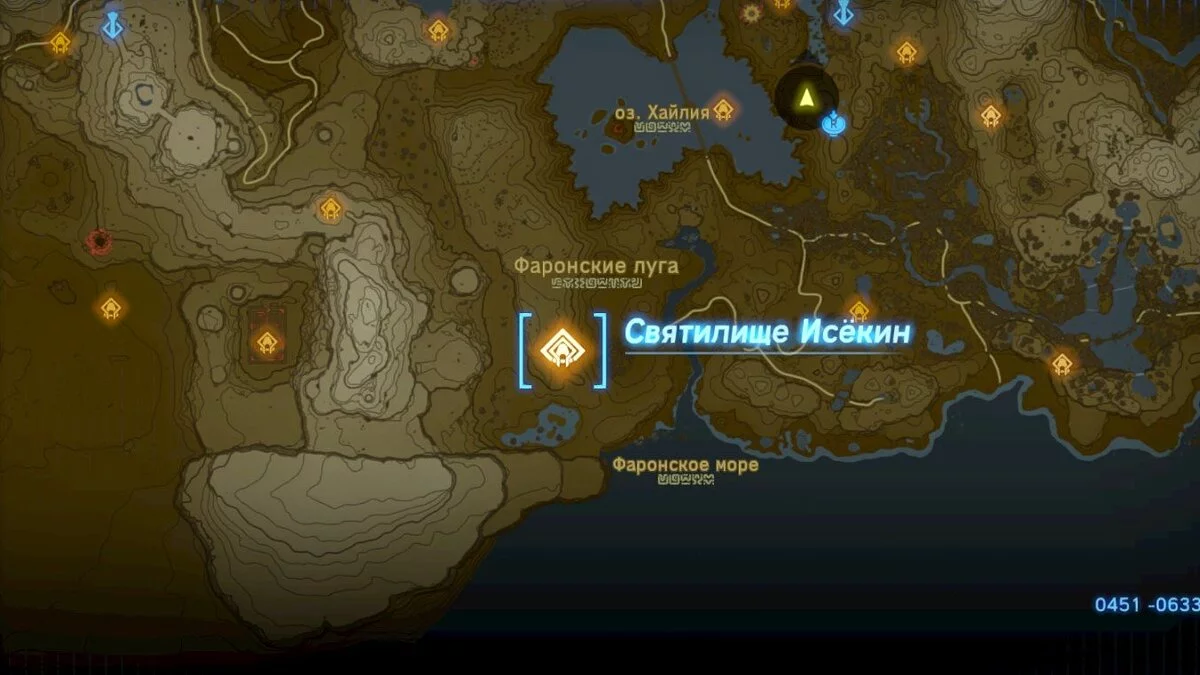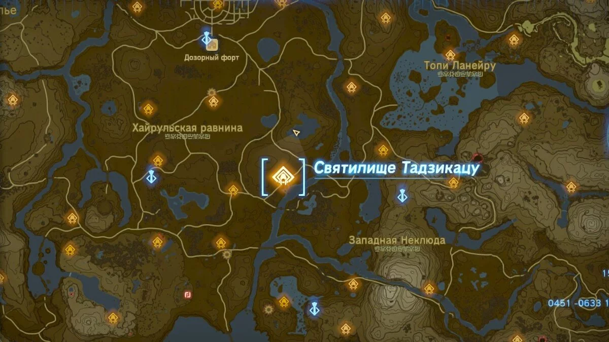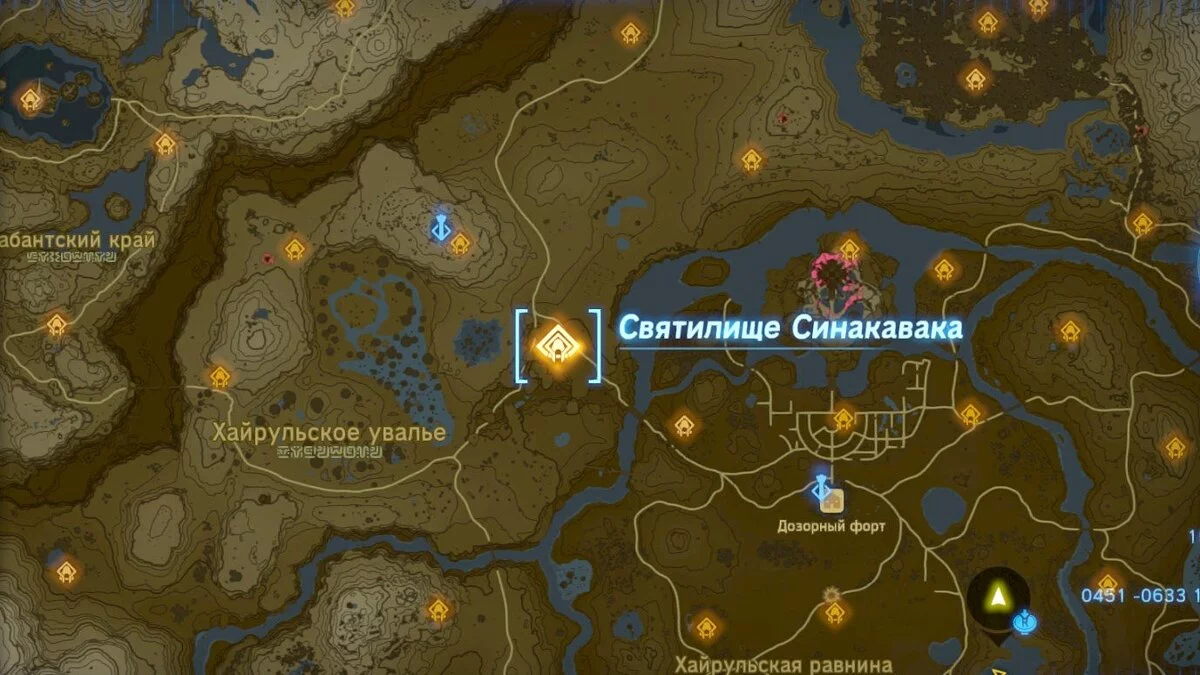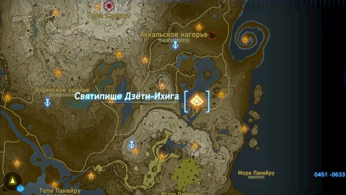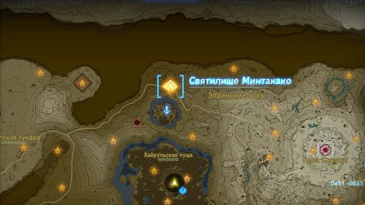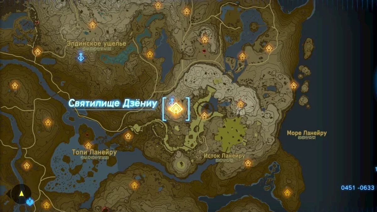 - Местонахождение: Святилище расположено к юго-западу от конюшни «Снежная» . Спрятан в пещере «Азанские насосы». Вход в пещеру находится в южной части «Южной тундры». Войдя в пещеру, Линк должен пересечь ледяную воду;