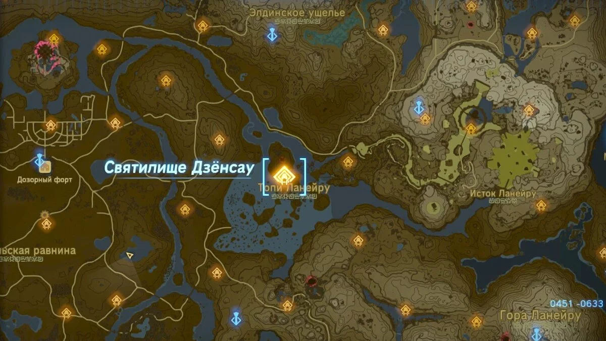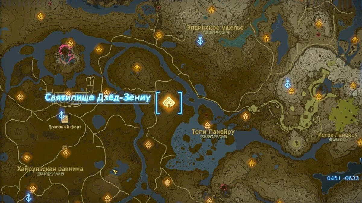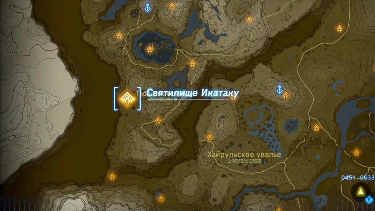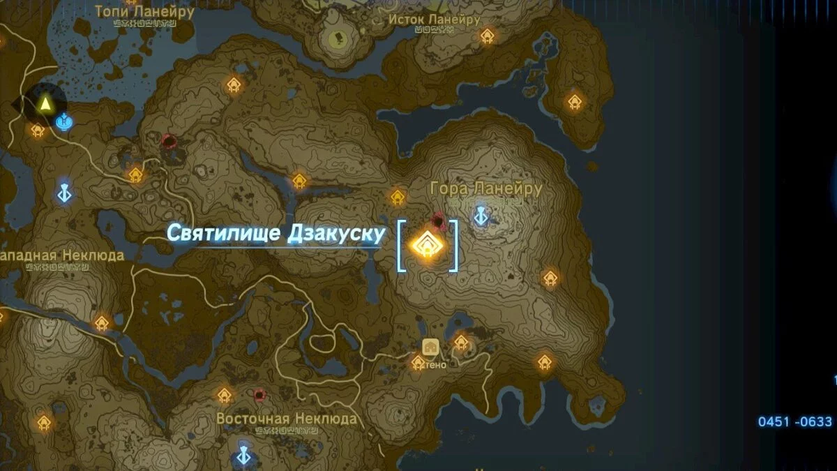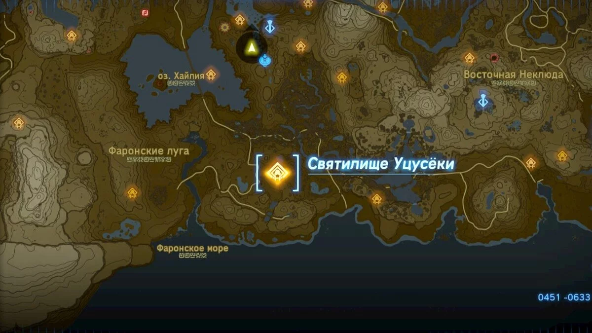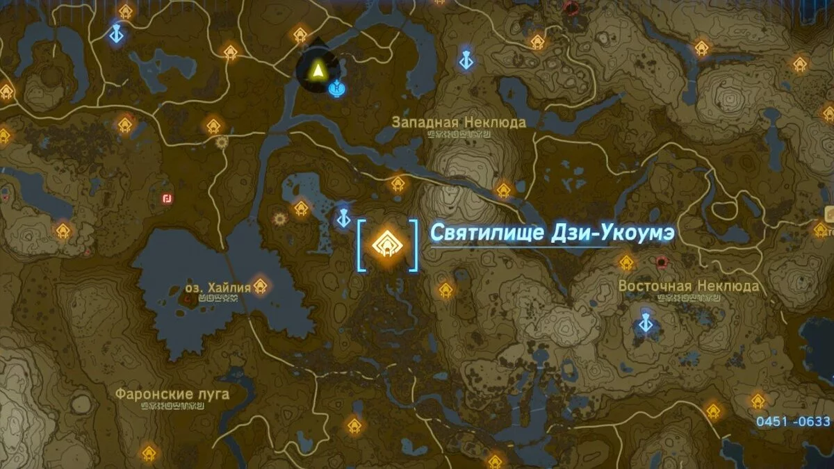 - Местонахождение: Святилище расположено к юго-западу от конюшни «Снежная» . Спрятан в пещере «Азанские насосы». Вход в пещеру находится в южной части «Южной тундры». Войдя в пещеру, Линк должен пересечь ледяную воду;