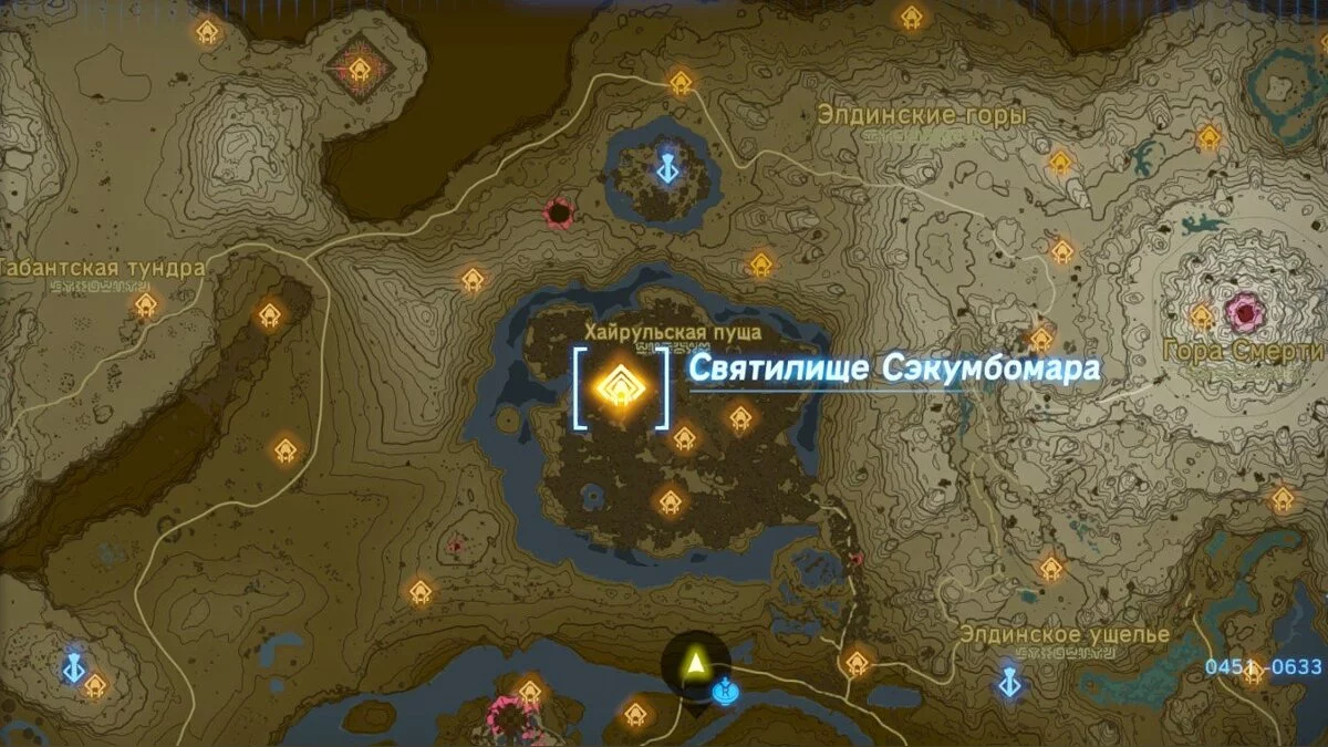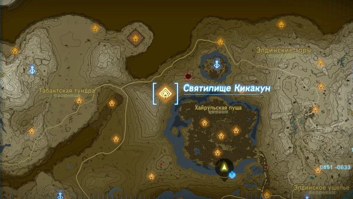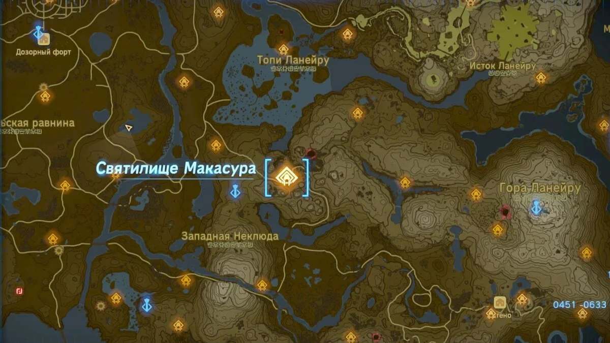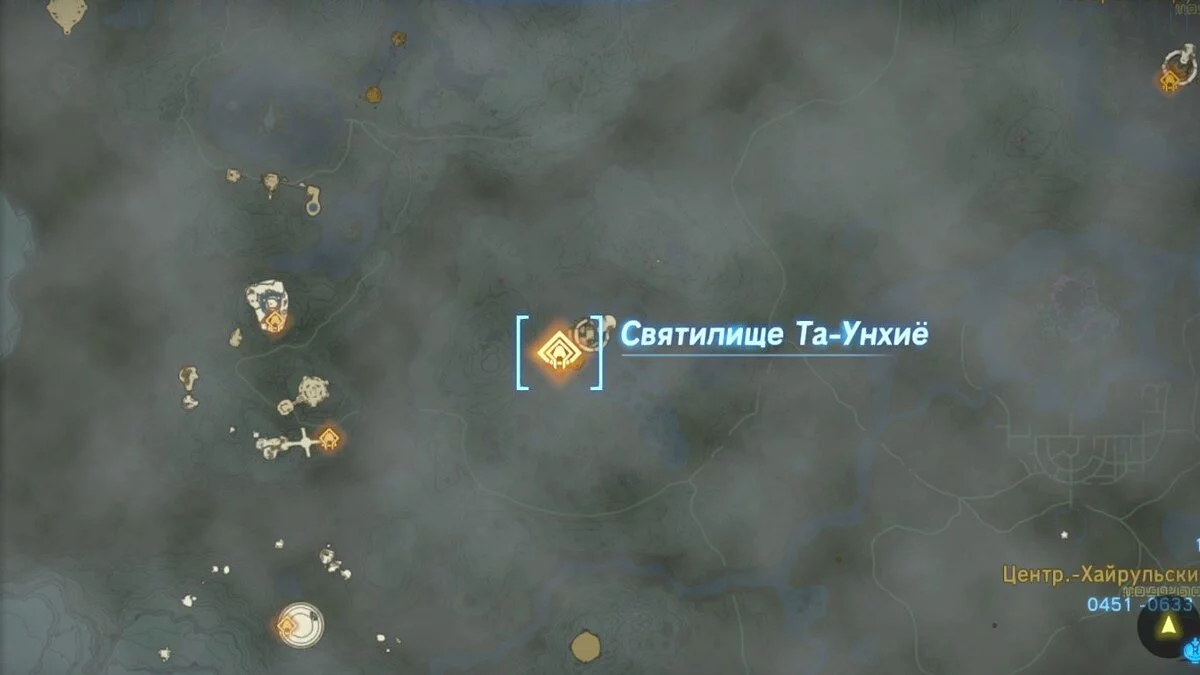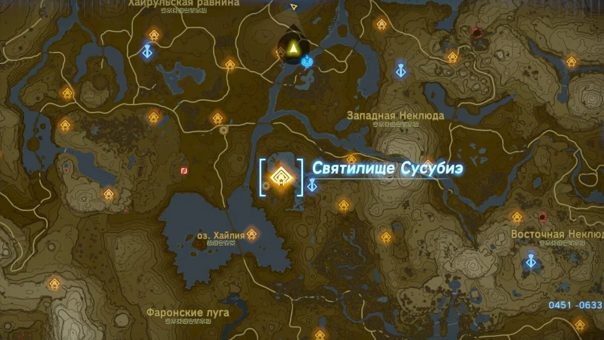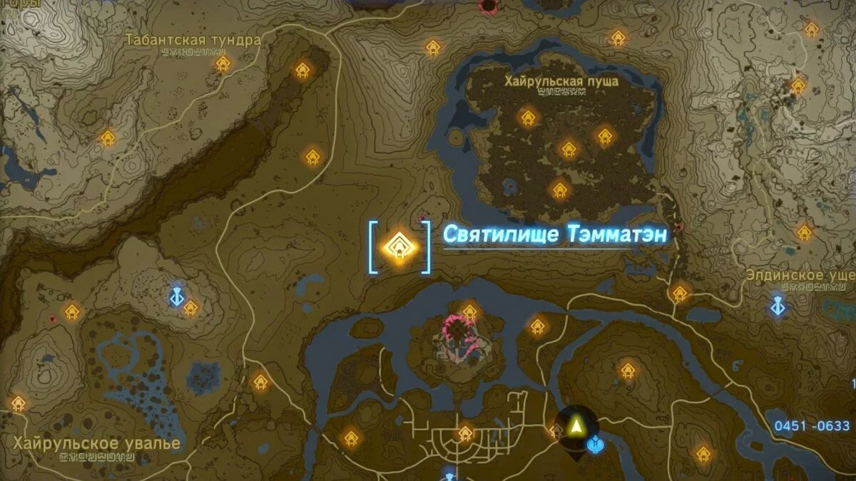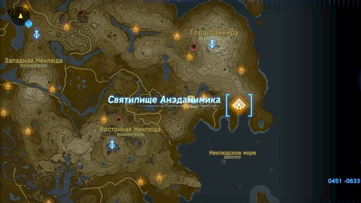 - Местонахождение: Святилище расположено к юго-западу от конюшни «Снежная» . Спрятан в пещере «Азанские насосы». Вход в пещеру находится в южной части «Южной тундры». Войдя в пещеру, Линк должен пересечь ледяную воду;
