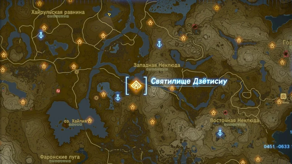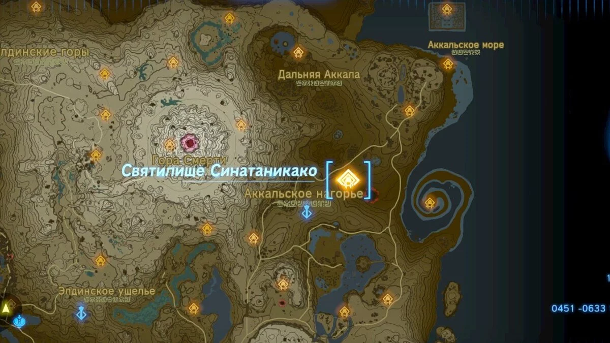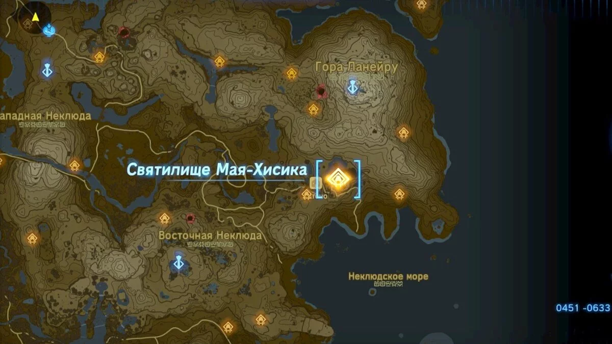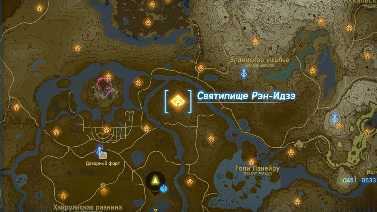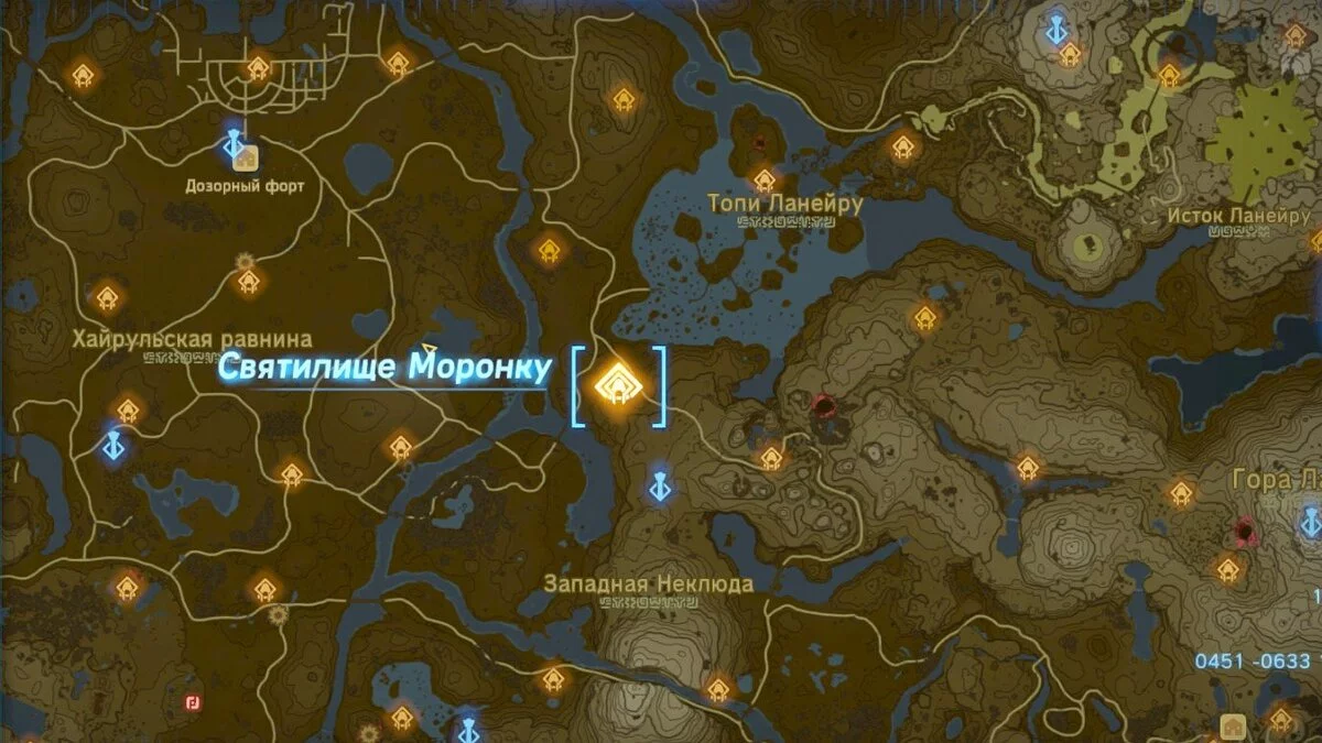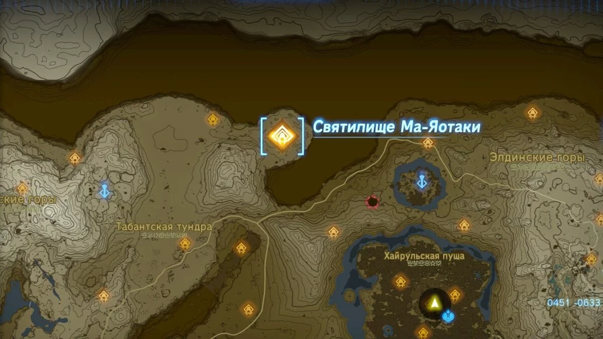 - Местонахождение: Святилище расположено к юго-западу от конюшни «Снежная» . Спрятан в пещере «Азанские насосы». Вход в пещеру находится в южной части «Южной тундры». Войдя в пещеру, Линк должен пересечь ледяную воду;