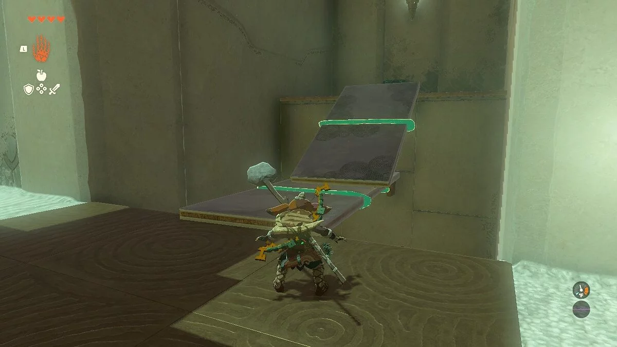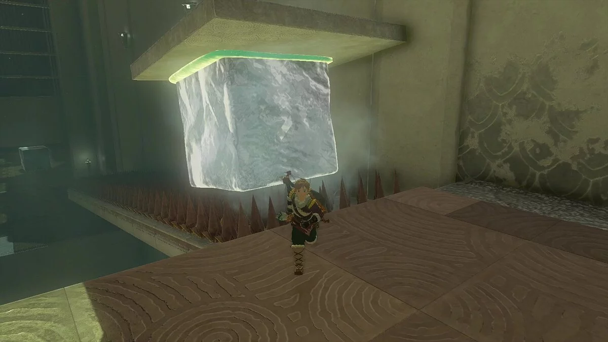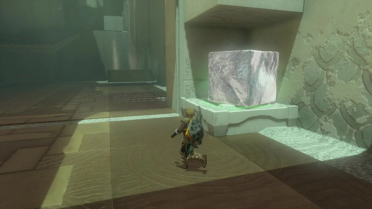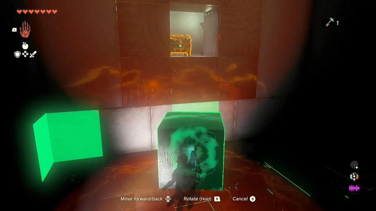 Возьмите гигантский куб рядом со входом в святилище и прикрепите его к одной стороне плиточного моста. Переместите его к ущелью по левой стороне, где висит сундук на веревке. Перережьте веревку, чтобы сбросить сундук на мост. Откройте его, чтобы получить Маленький Ключ.