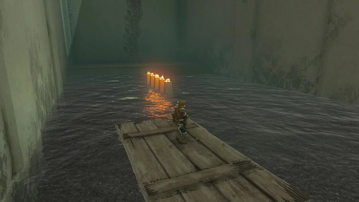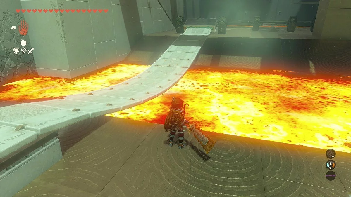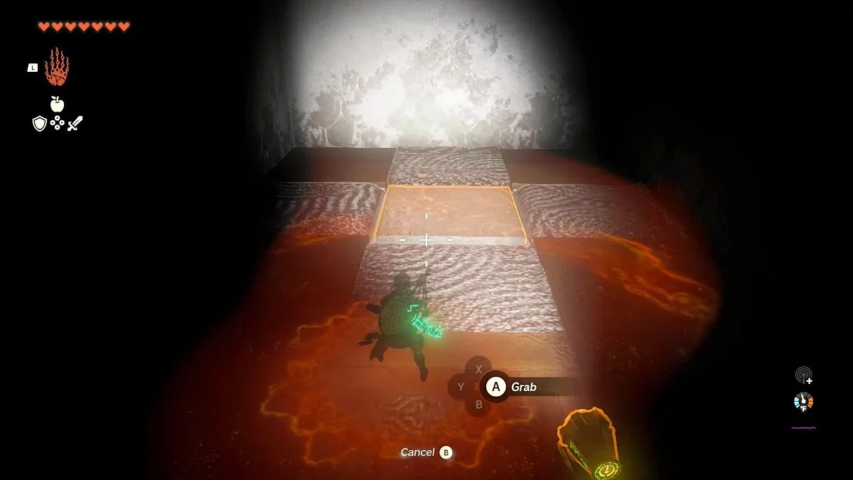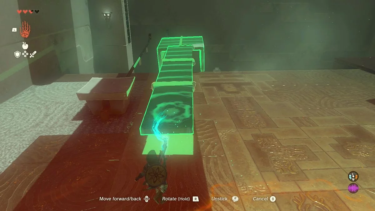 Возьмите гигантский куб рядом со входом в святилище и прикрепите его к одной стороне плиточного моста. Переместите его к ущелью по левой стороне, где висит сундук на веревке. Перережьте веревку, чтобы сбросить сундук на мост. Откройте его, чтобы получить Маленький Ключ.