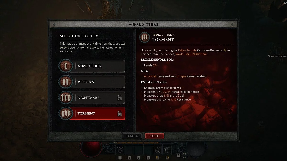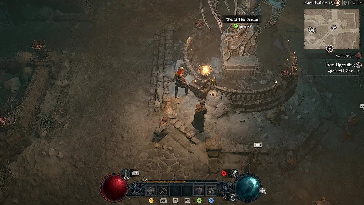 Система мировых уровней — весьма полезный способ привыкнуть к основным механикам Diablo 4. Например, первый мировой уровень сложности рекомендуется для игроков 1–50 уровней. Вы всегда можете повысить сложность в любое время. Достаточно лишь дойти до определенной статуи в Киовашаде.