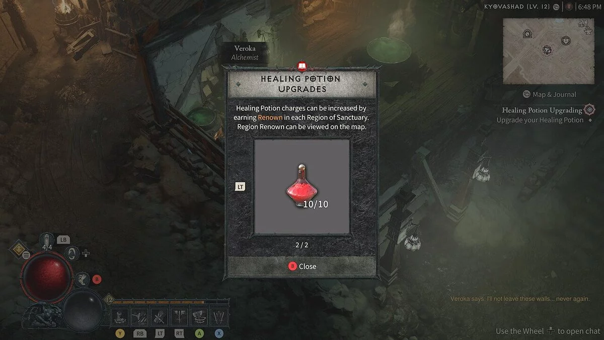 В прошлых играх серии вы могли закупиться лечебными зельями и в подземельях не беспокоится о потраченном здоровье. В Diablo 4 все по другому. На первых уровнях вы не сможете носить собой больше 4-х флаконов. Чтобы увеличить их количество, придется выполнять второстепенные квесты и «зачищать» карту от активностей.