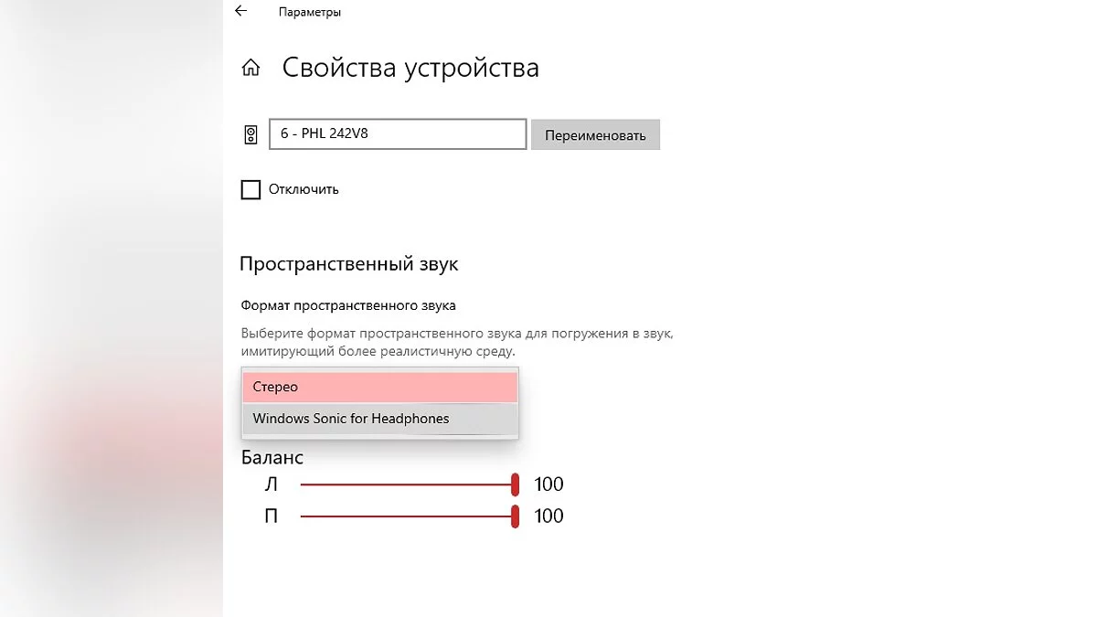 - В строке пространственного звука измените значение со «Стерео» на «Windows Sonic for Headphones»;