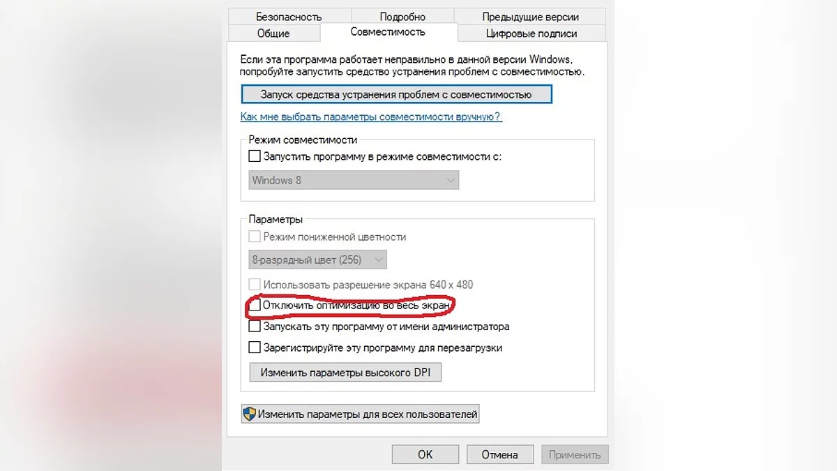 - Зайдите во вкладку «Совместимость» и поставьте флажок на пункте «Отключить оптимизацию во весь экран»;