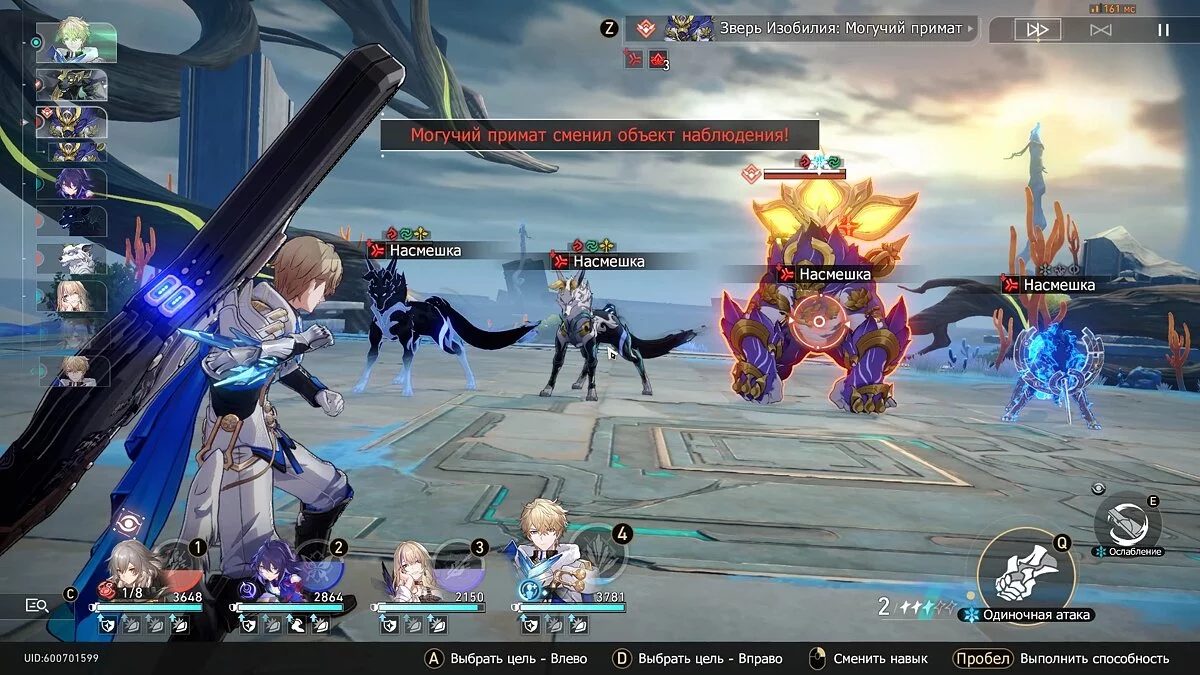 Могучий примат использует способность, при которой меняет объект наблюдения (атакуемого персонажа) каждый раз, после применения навыка. Поэтому, если в вашем отряде есть герой с небольшим количеством защиты (например, Зеле), старайтесь, чтобы значок глаза не находился на ней перед тем, как босс выполнит удар.