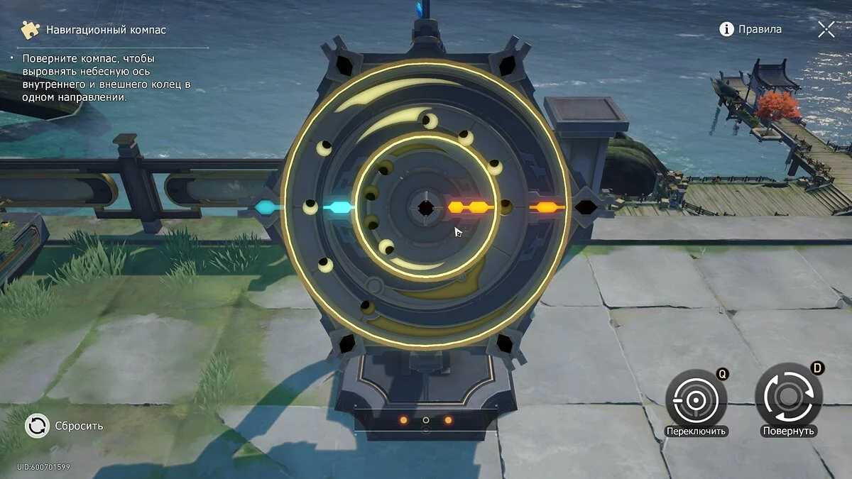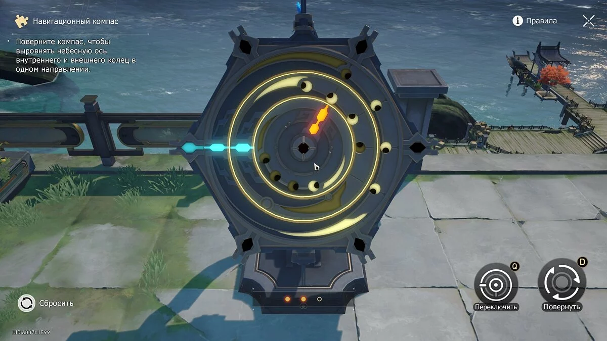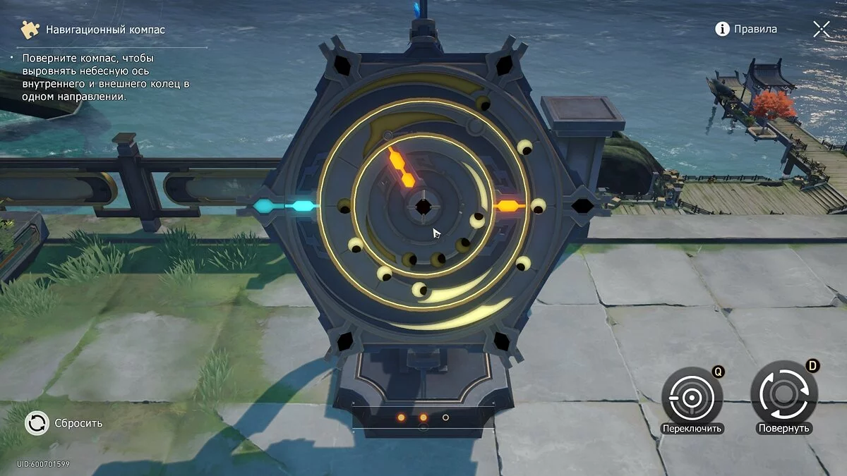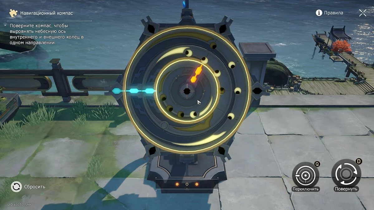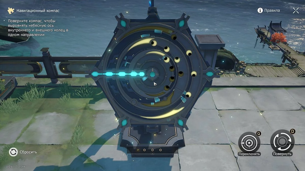 Теперь взаимодействуйте с навигационным компасом и решите загадку. Выберите большой и малый диски, поверните их один раз. Затем выберите средний и малый диски и поверните их три раза.