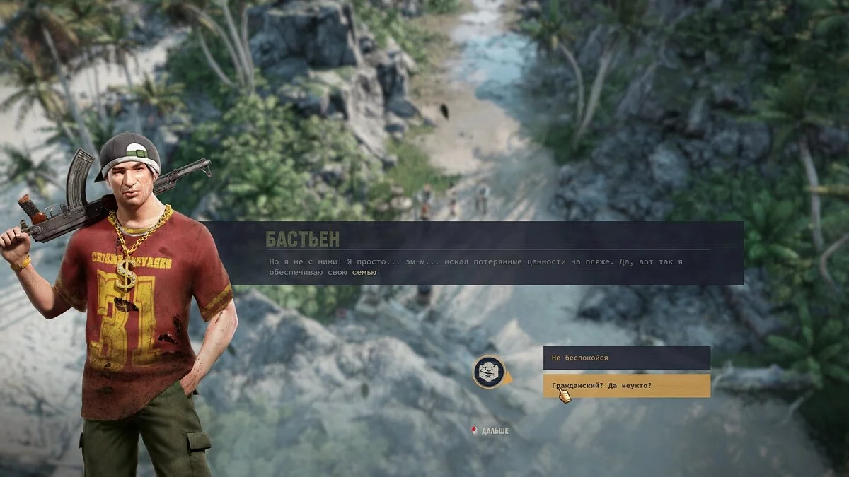 В нижней части острова вы можете встретить парня по имени Бастьен. Сейчас он не опасен, однако в дальнейшем может представлять угрозу для вашего отряда. Вкратце, если не убьёте его сейчас, то позднее он ещё повстречается вам, а также может принимать участие в обороне форта на острове. Подробнее о всех развилках с Бастьеном мы рассказали здесь. Самый лучший вариант — получить от него алмазы, затем рассказать его товарищам о том, что он у них ворует.