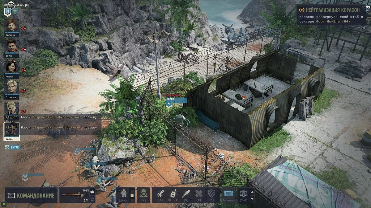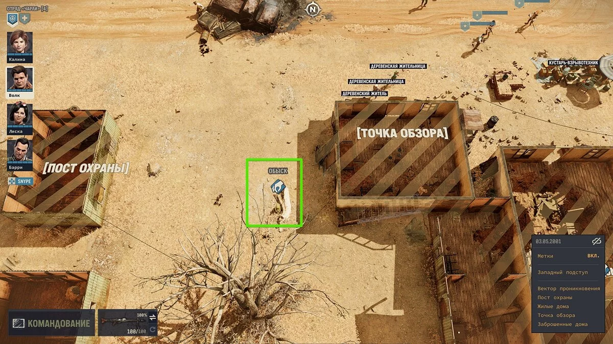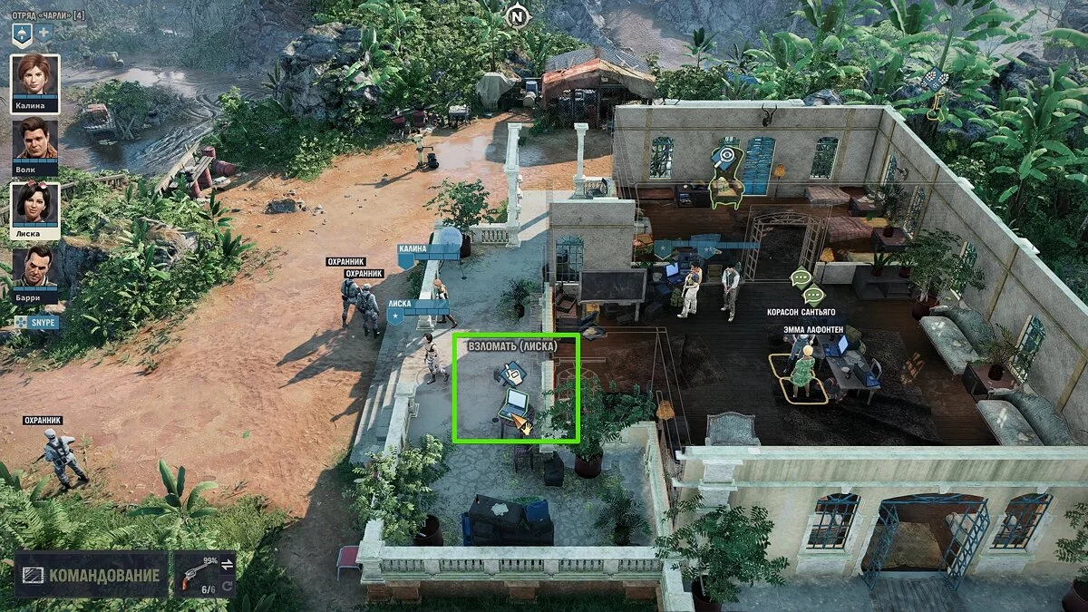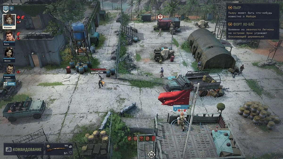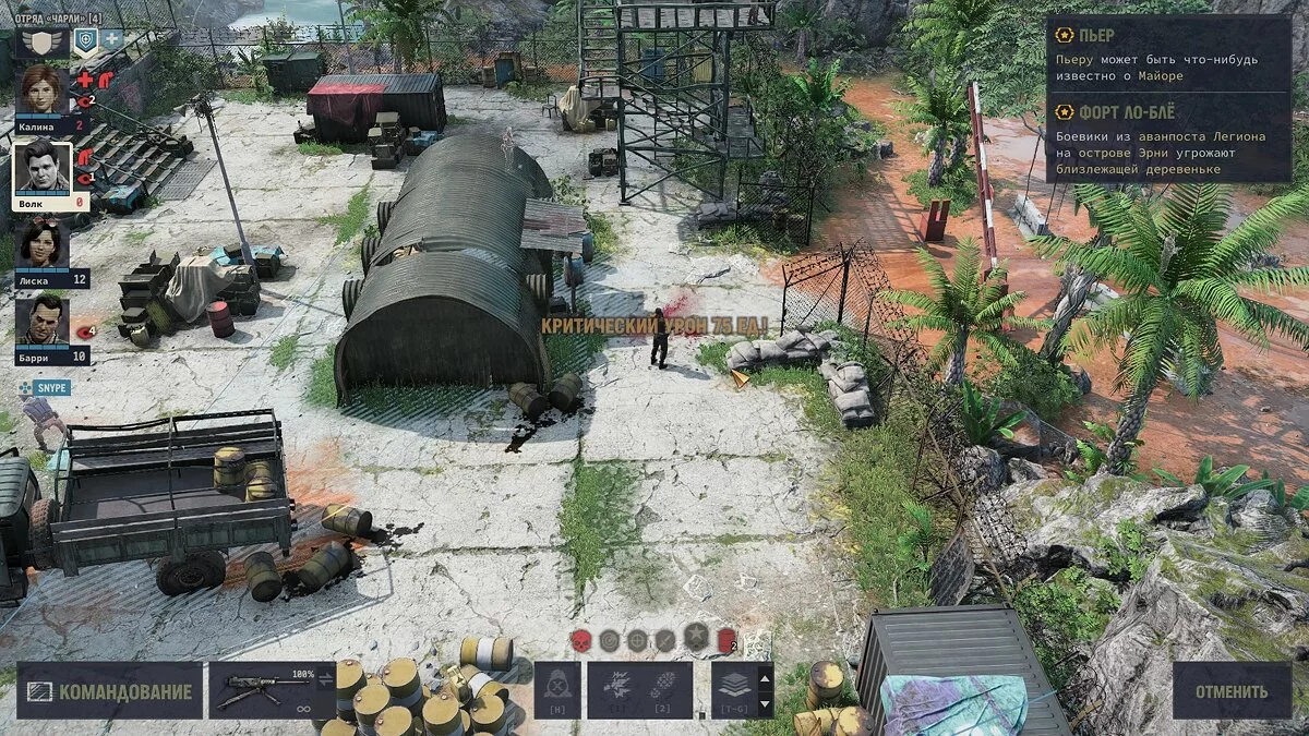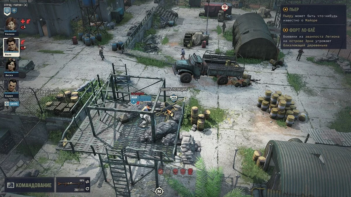 Когда все разведданные будут получены, можно приступать к штурму форта. Изначально вы можете подойти и пообщаться с предводителем бандитов по имени Пьер, однако мы не рекомендуем тратить на это время, а также выдавать своё местоположение. Вместо этого избавьтесь от забора в левой части карты и поднимитесь на вышку бойцом-универсалом, а также снайпером.