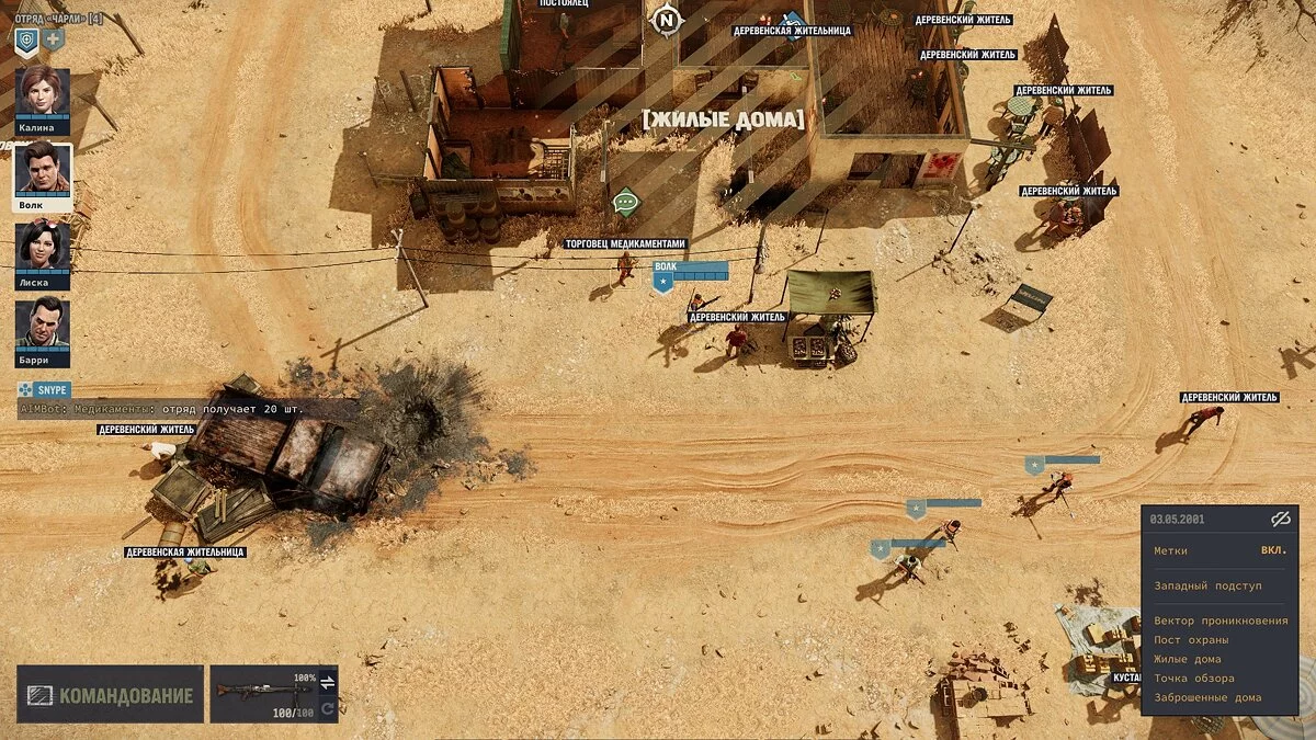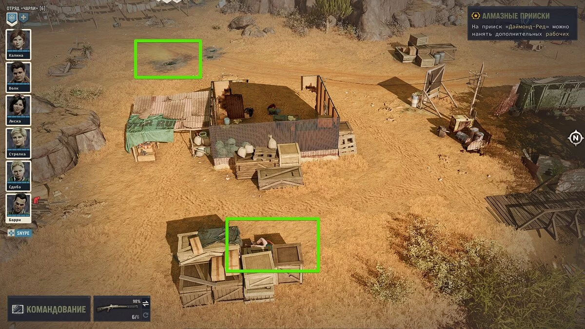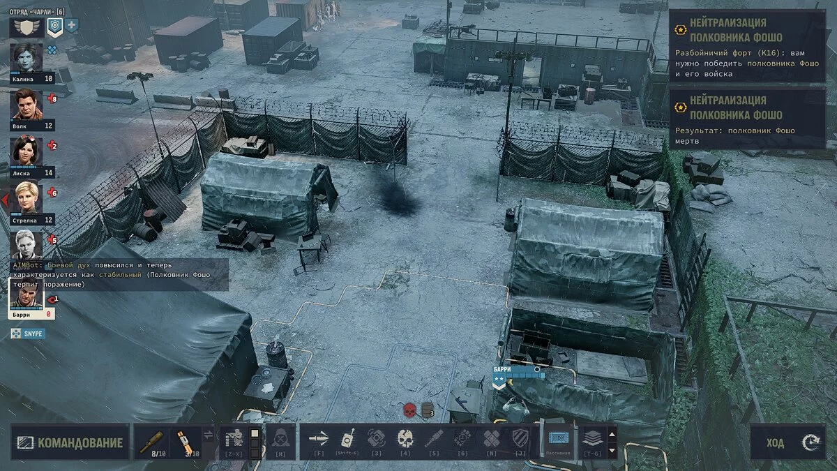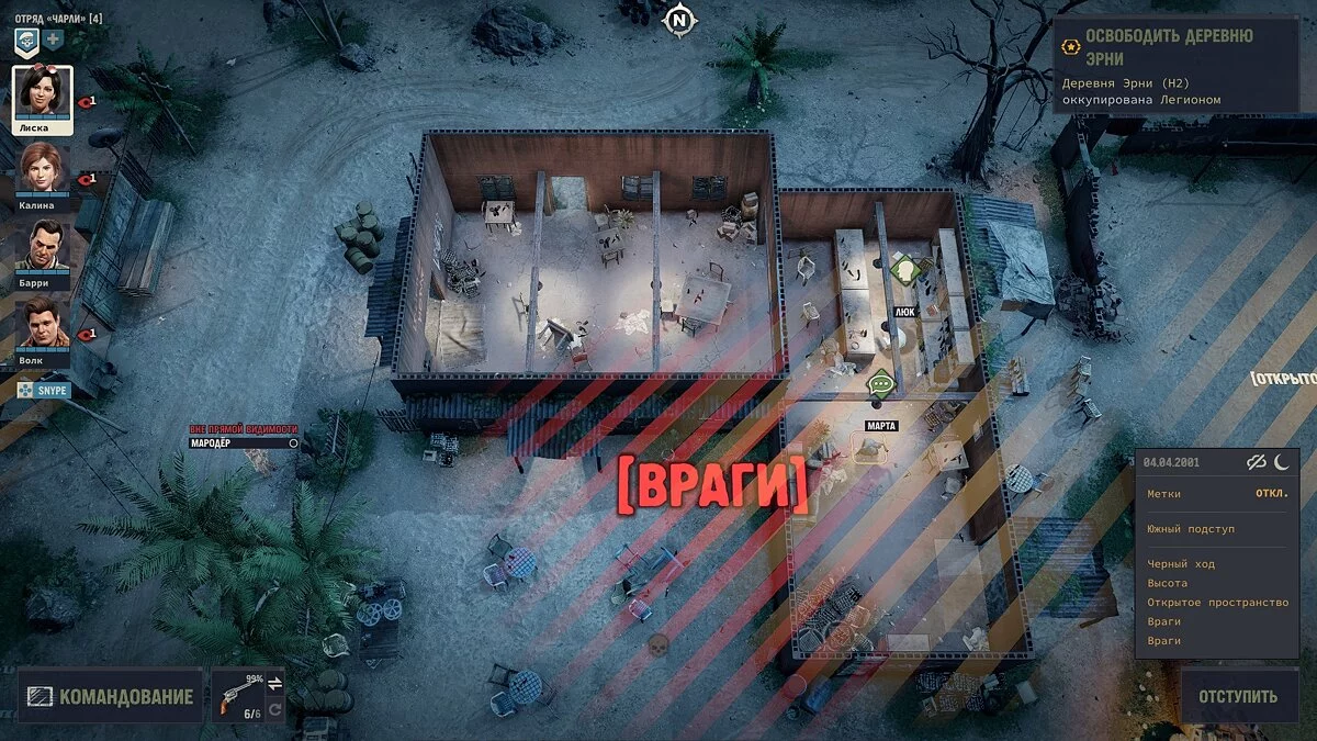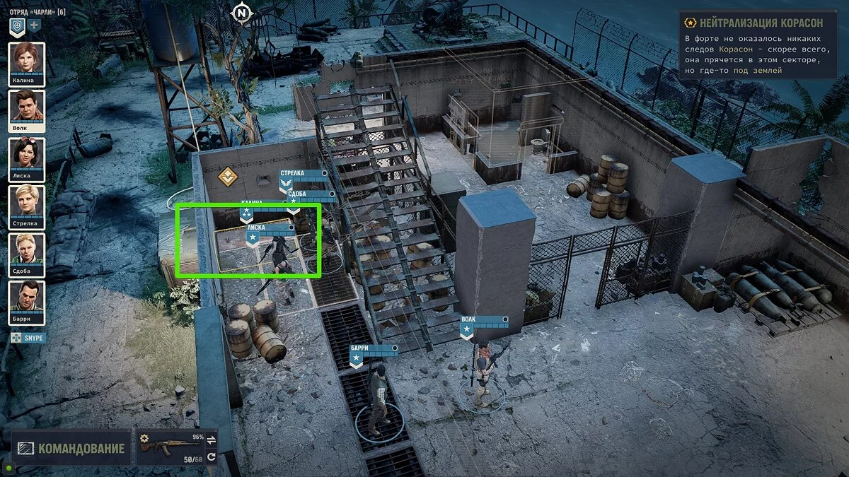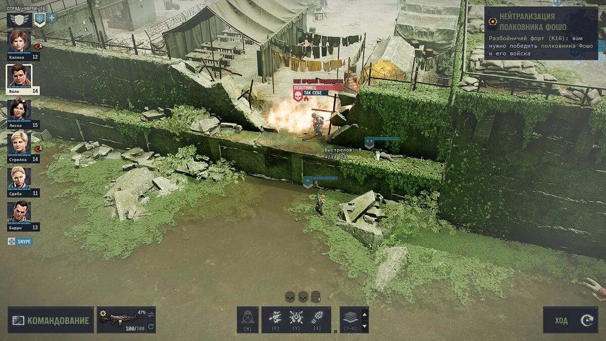 Когда все разведданные будут получены, можно приступать к штурму форта. Изначально вы можете подойти и пообщаться с предводителем бандитов по имени Пьер, однако мы не рекомендуем тратить на это время, а также выдавать своё местоположение. Вместо этого избавьтесь от забора в левой части карты и поднимитесь на вышку бойцом-универсалом, а также снайпером.