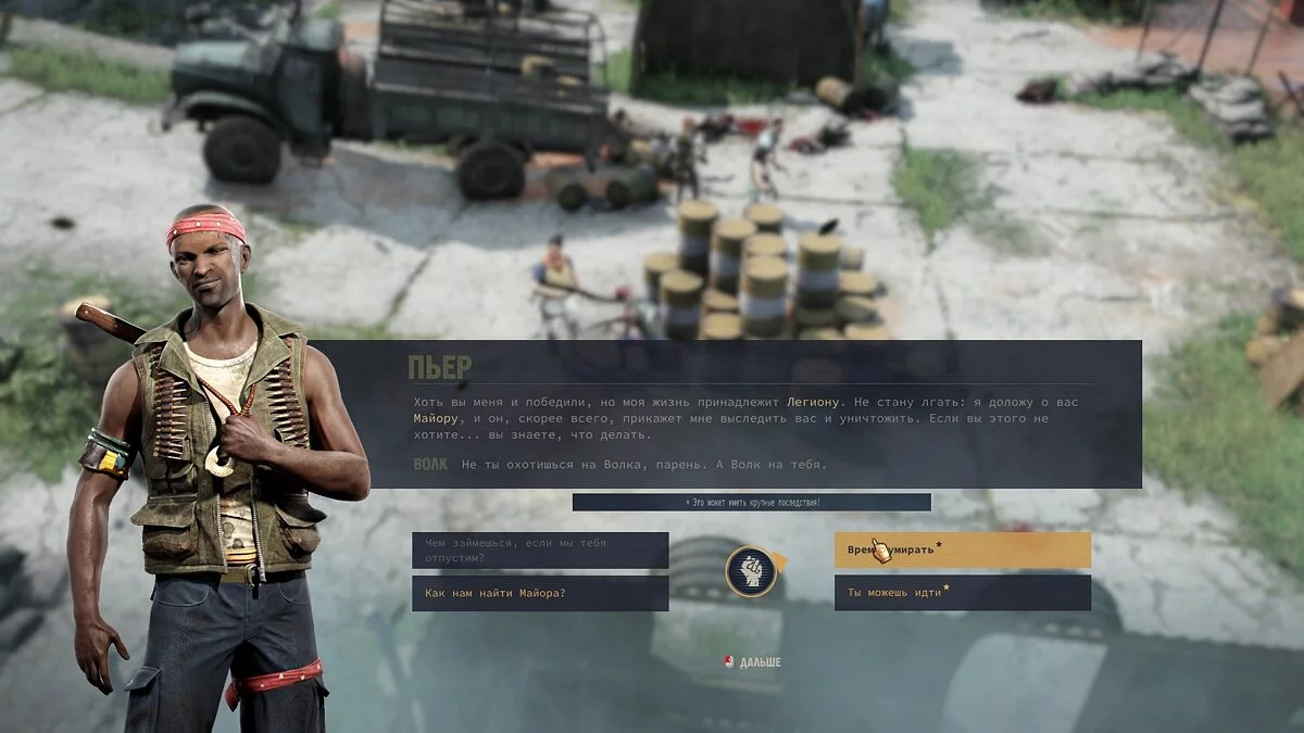 Дальше просто добейте врагов, а также снайпера, который перемещается от дальней вышки к зданию. По завершении боя можете подобрать алмазы, оружие, а также решить судьбу Пьера — убить или пощадить. Парень признается, что если пощадить его, он вернётся к Майору и снова будет служить ему, поэтому решили его убить.