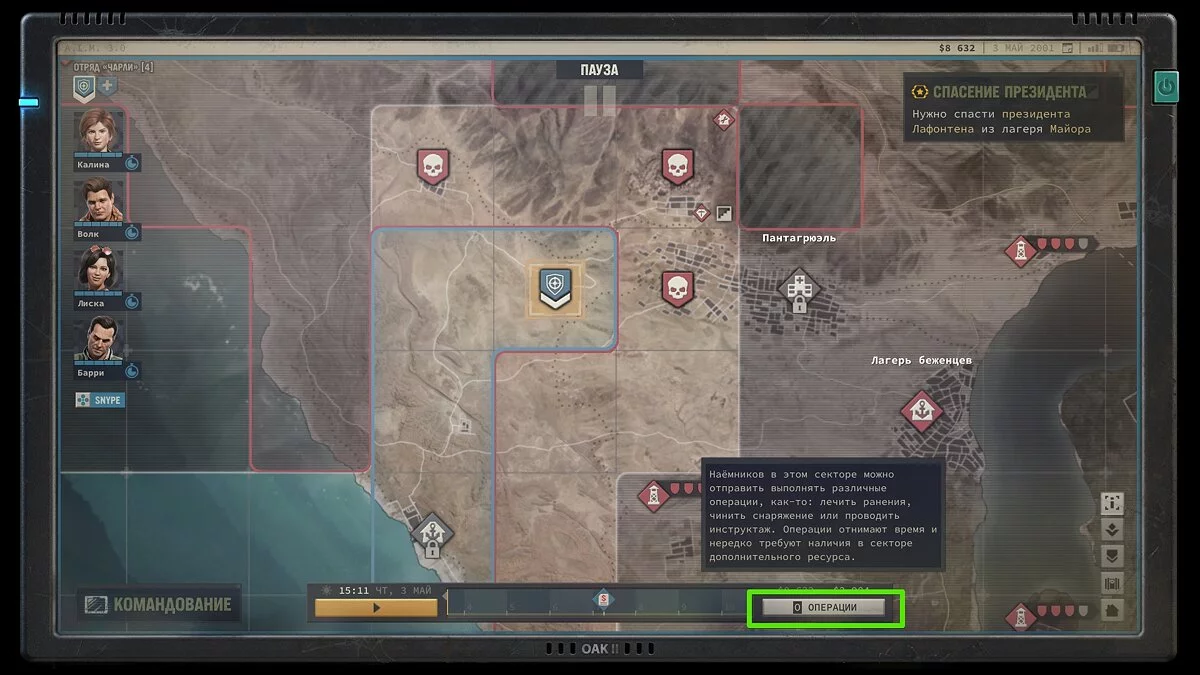 Перейдите на глобальную карту (вид со спутника) и нажмите «Операции», затем «Лечение ран». Выберите медика и пациентов. На таймлайне появится маркер, по достижении которого жизненные силы выбранного бойца будут полностью восстановлены.