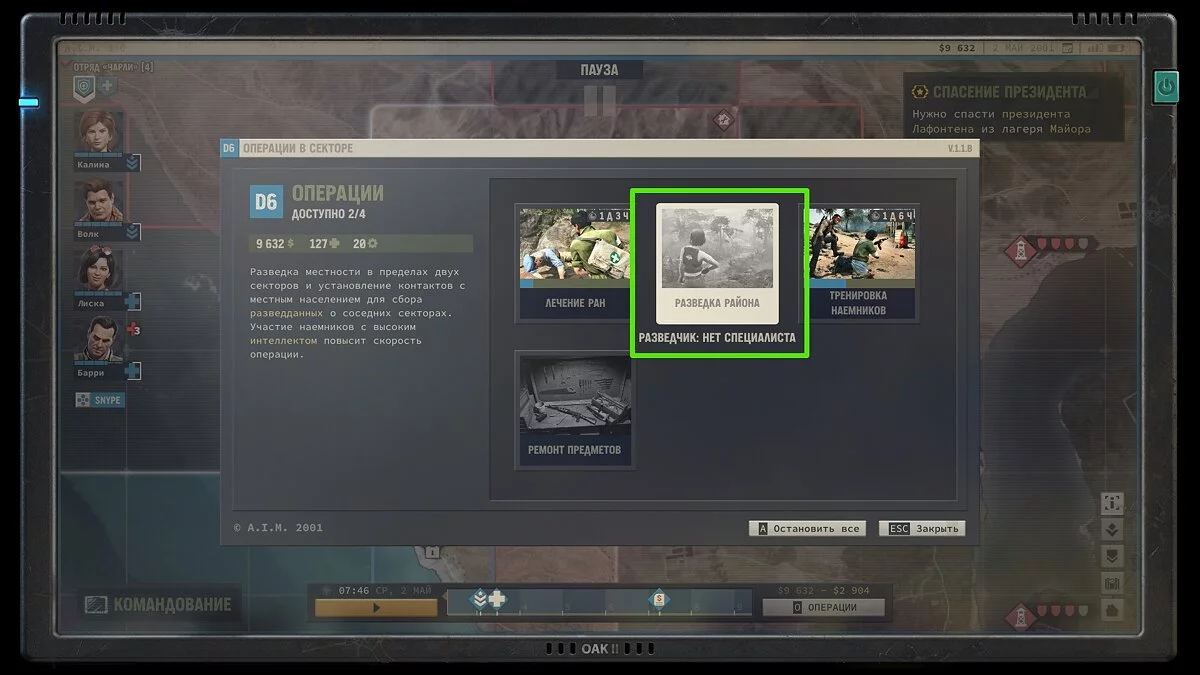 После освобождения этого квадрата вы сможете приобрести боеприпасы и медикаменты, а также взломать телефон в баре и получить разведданные.