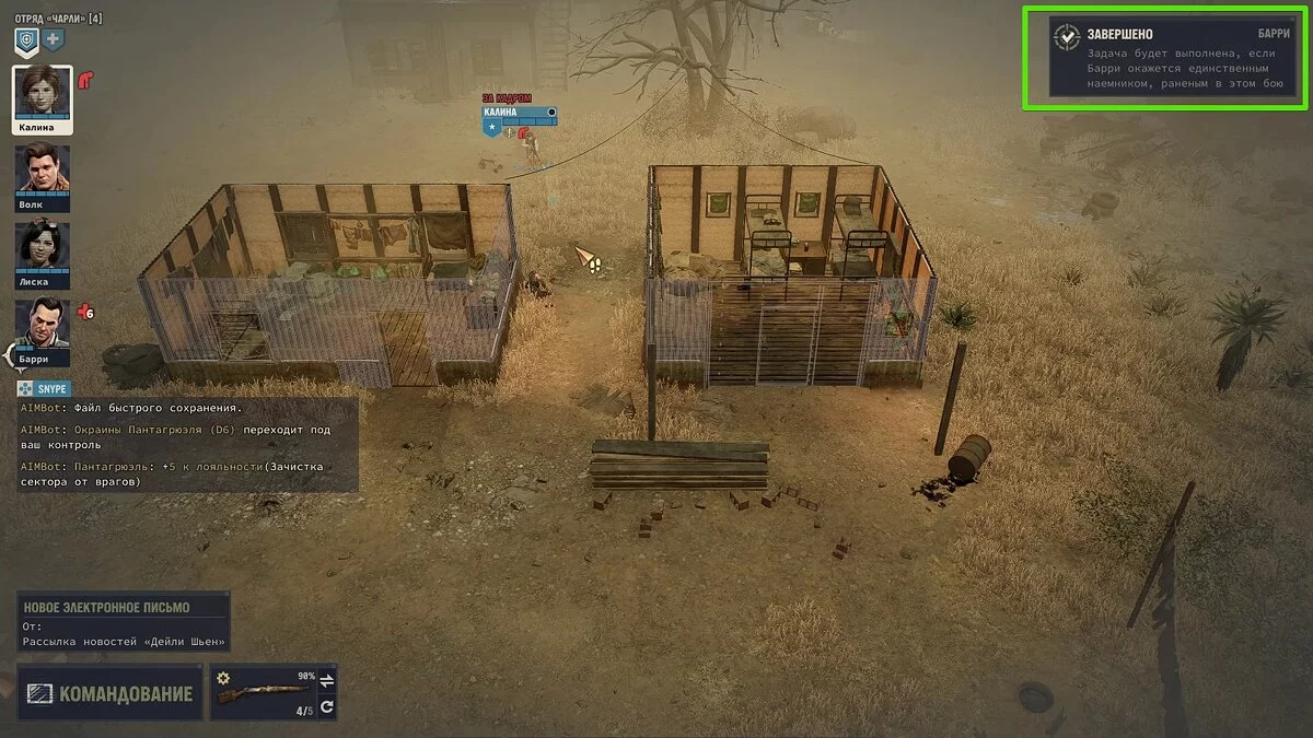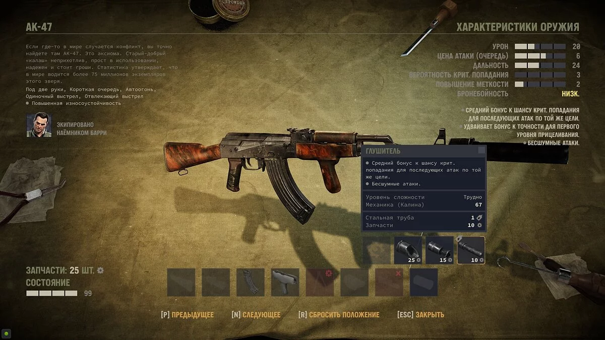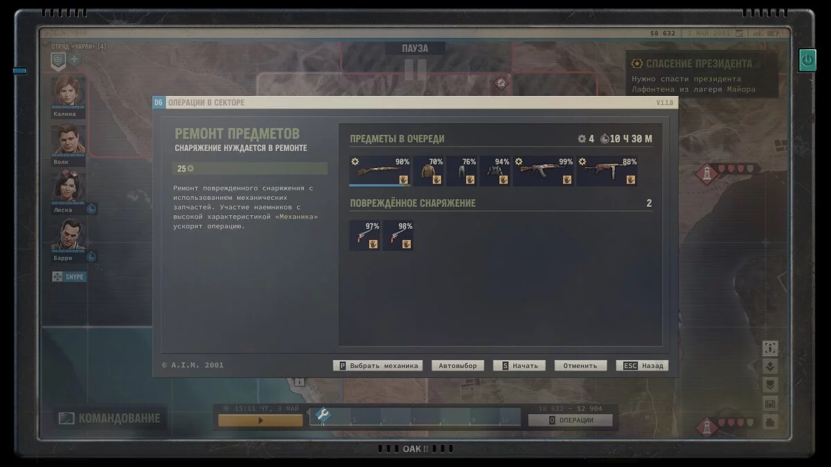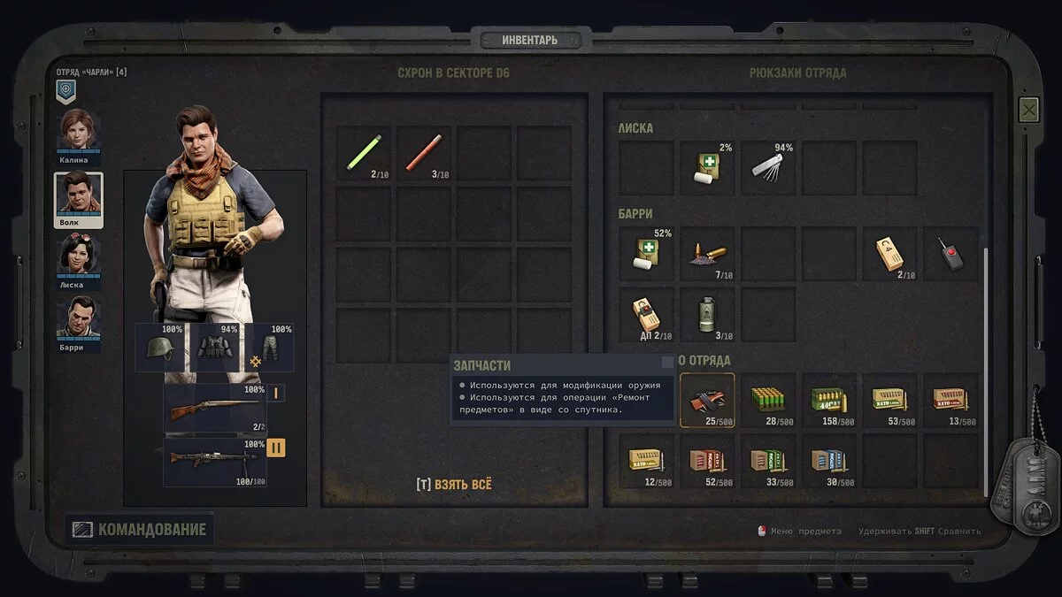 После сбора ресурсов и материалов обязательно модифицируйте оружие своих наемников, чтобы увеличить общую огневую мощь. Не стоит продавать запчасти, так как они имеют решающее значение для модификации и ремонта оружия и снаряжения.