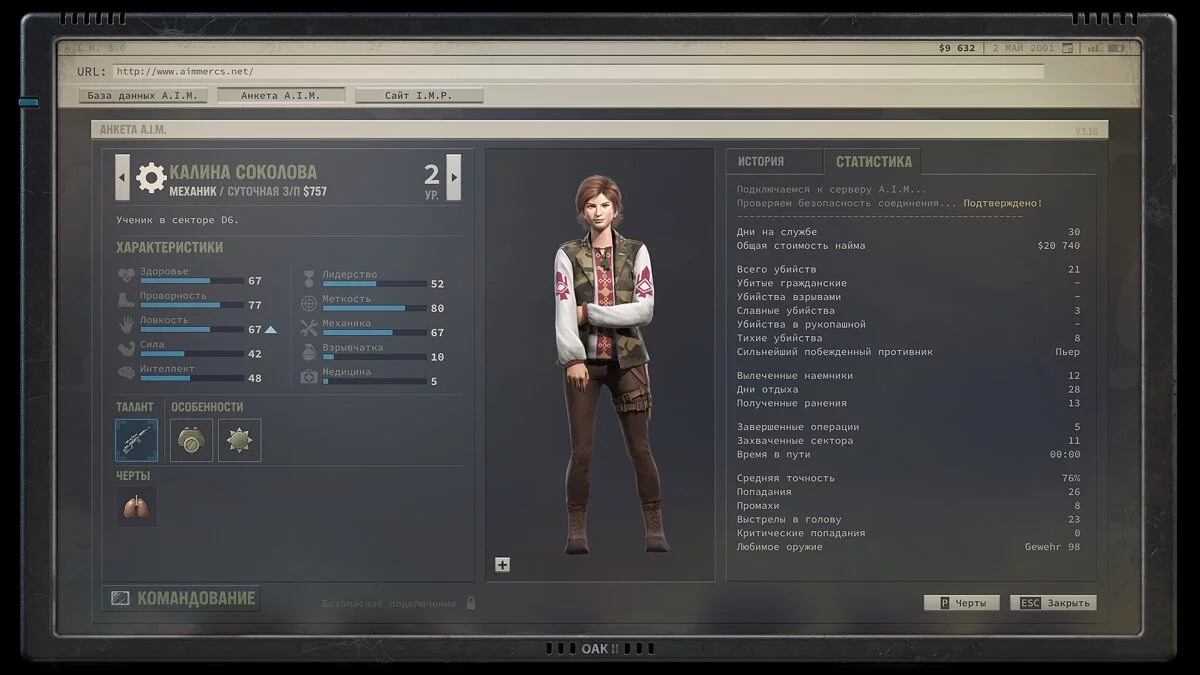 Калина. Отличный механик и снайпер по совместительству. Изначально экипирована снайперской винтовкой, которую вы можете передать Лиске либо использовать у её владельца. Тем не менее, если вы выберите её, то придётся постоянно тренировать меткость этому герою.