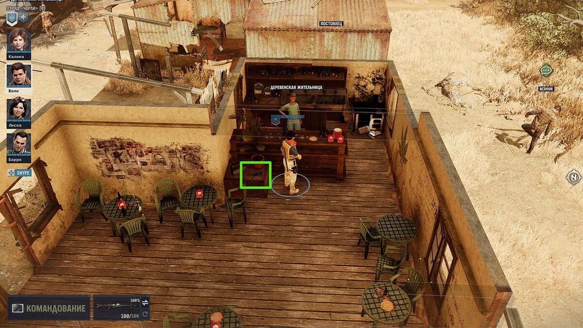 Здесь обязательно переключитесь на тактический режим, чтобы попасть на минное поле. Если в вашем отряде есть Барри или другой взрывотехник, после сражения можете обезвредить все мины, а также побеседовать с местной любительницей взрывчатки.