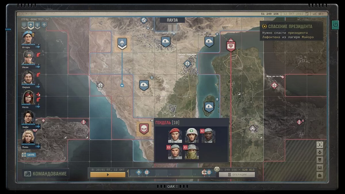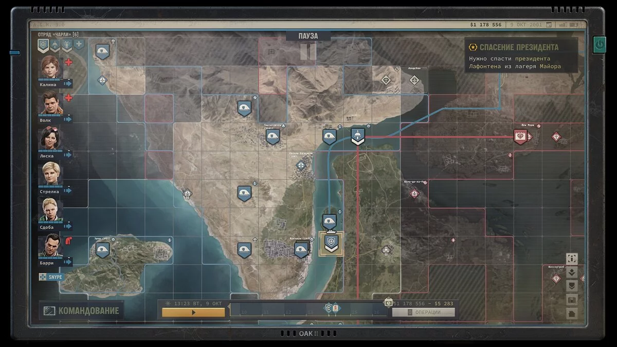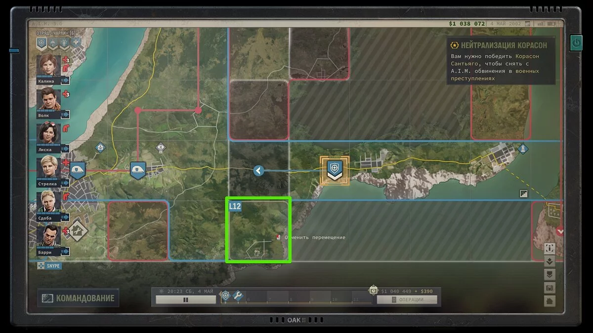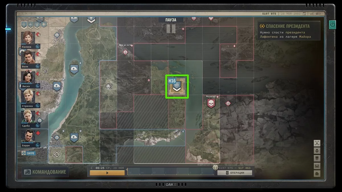 После квадрата «B16» по пути к базе Майора вы будете сталкиваться с отрядами головорезов — их можно уничтожать в автоматическом режиме. Также рекомендуем осматривать локации и находить разведданные — это поможет лучше узнать местность и спасти президента. Если этого не сделать, то вы появитесь в нижней части локации, а похищенный президент будет находиться на возвышенности в левой верхней части карты. Таким образом, вы просто не успеете добраться до него, и персонаж погибнет.