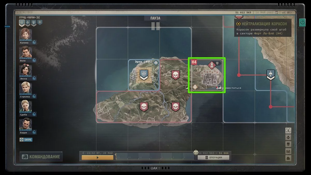 На данной локации вас также ждёт группа врагов, после устранения которой вы сможете подобрать разведданные. Если вы посещали предыдущие локации и собрали все описанные файлы, то должны были полностью ослабить форт. В противном случае перейдите в меню «Операции» и пошлите любого оперативника на разведку района.