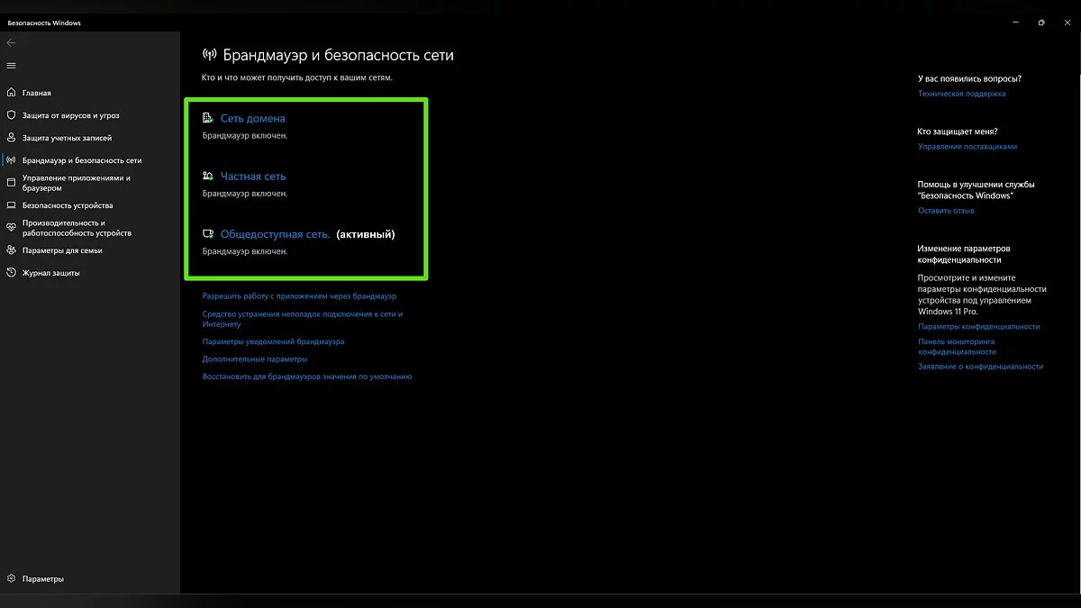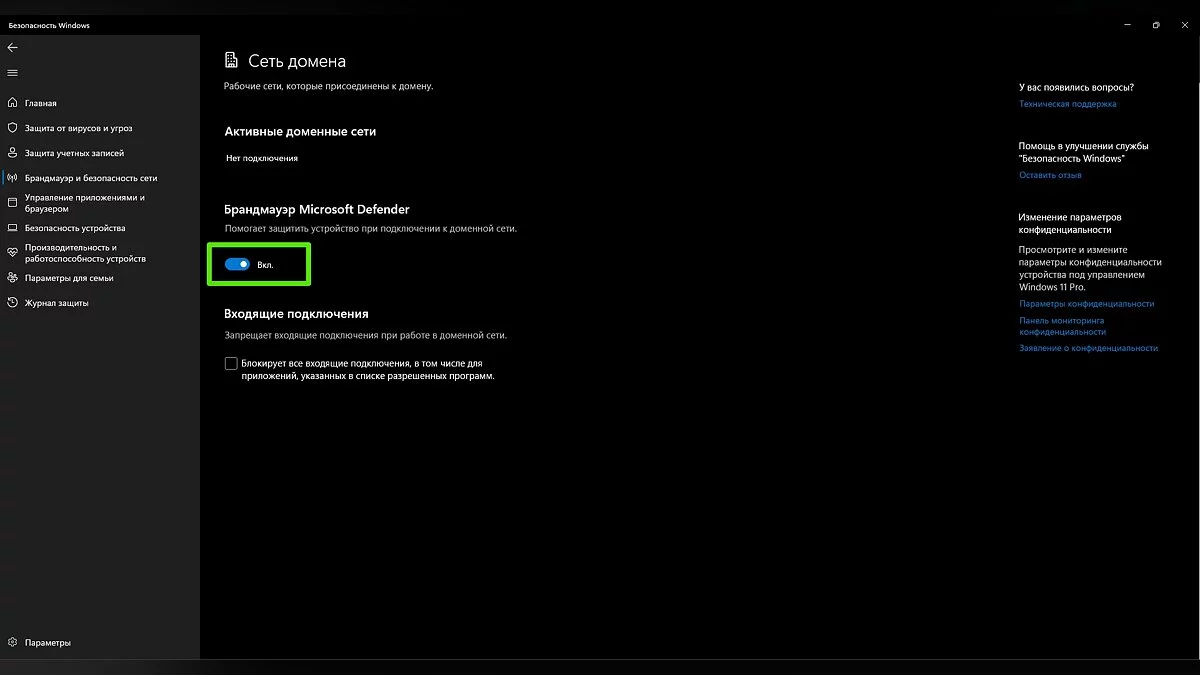 - Выберите одну из нескольких сетей («Сеть домена», «Частная сеть» и «Общедоступная сеть») и нажмите «Выкл.»;