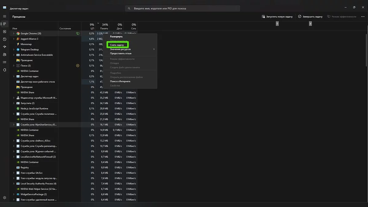 - Выберите нужные процессы, нажмите ПКМ и кликните «Снять задачу».