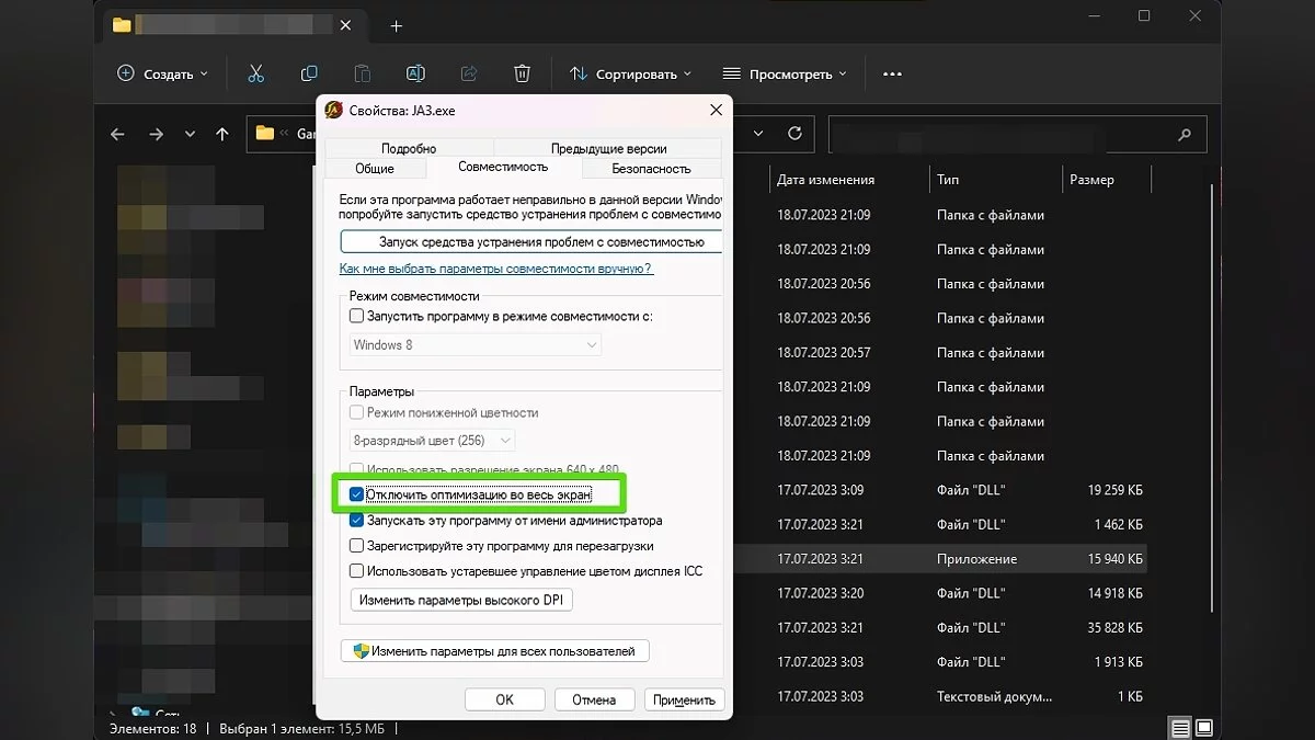 Функция полноэкранной оптимизации включена по умолчанию для каждого отдельного приложения, но это также может привести к сбоям и ошибкам при запуске: