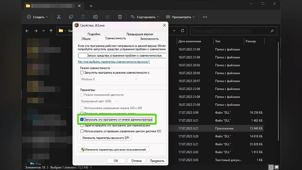 - Установите флажок напротив пункта «Запускать эту программу от имени администратора»;