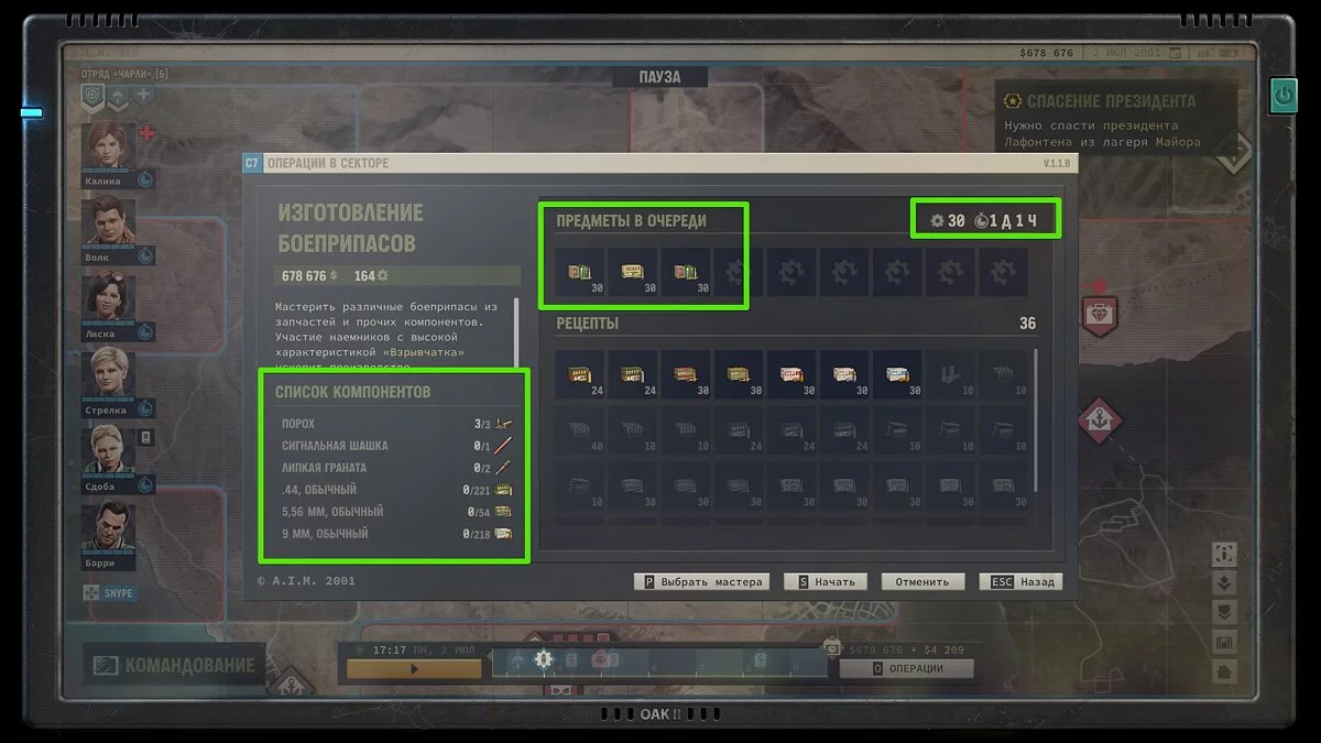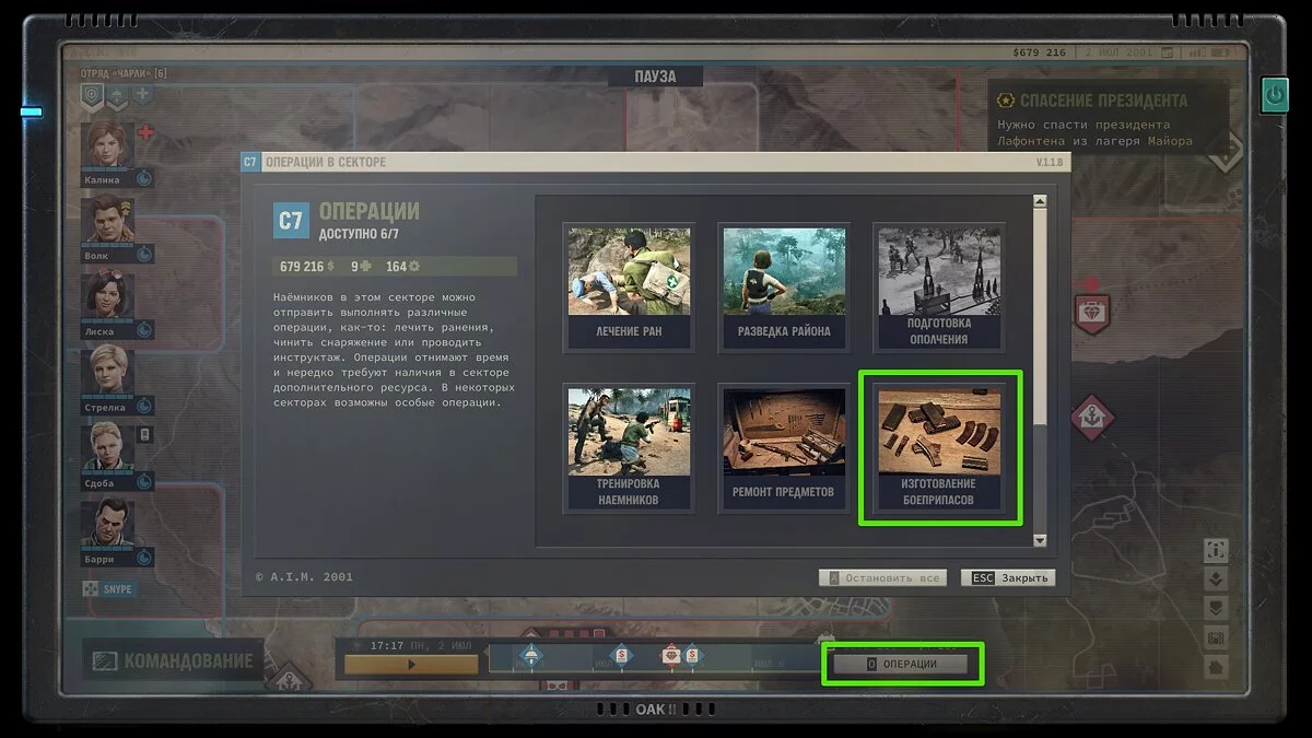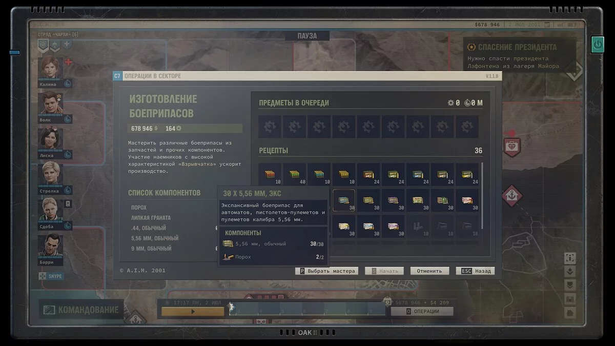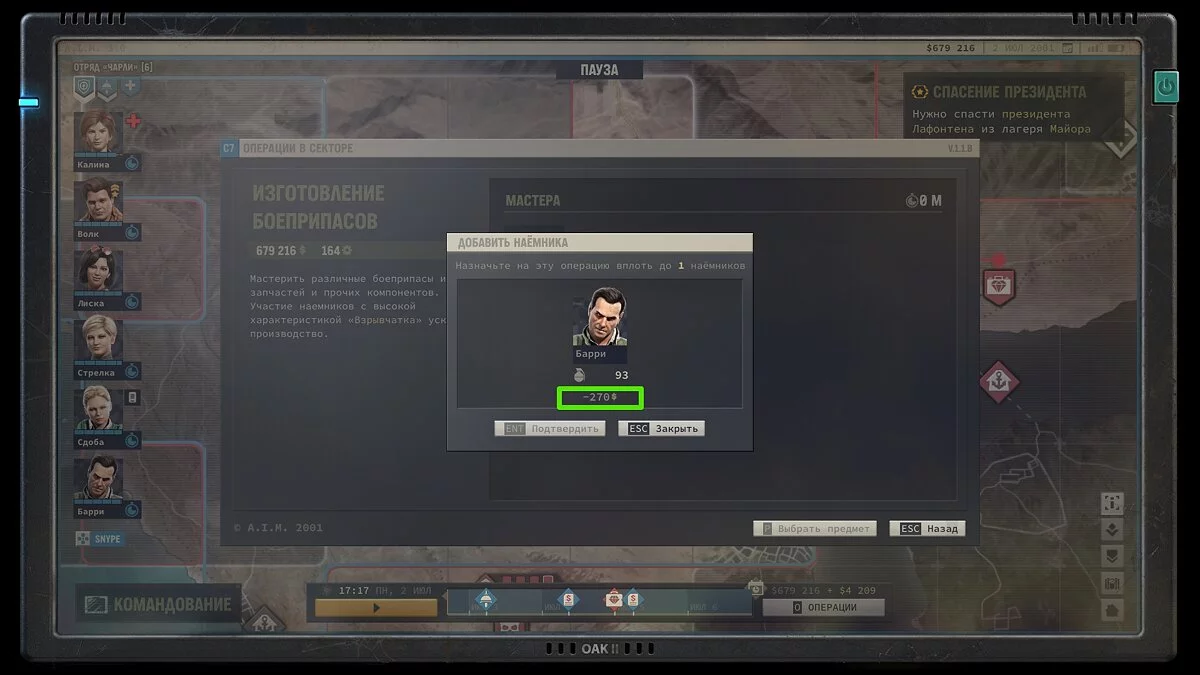 Выберите «Изготовление боеприпасов» и назначьте мастера на эту операцию. Если вы следовали нашим советам по выбору наёмников в стартовый отряд, то наверняка заключили контракт с Барри — отличным взрывотехником. Стартовая цена создания патронов у этого персонажа — $300, но со временем она будет снижаться.