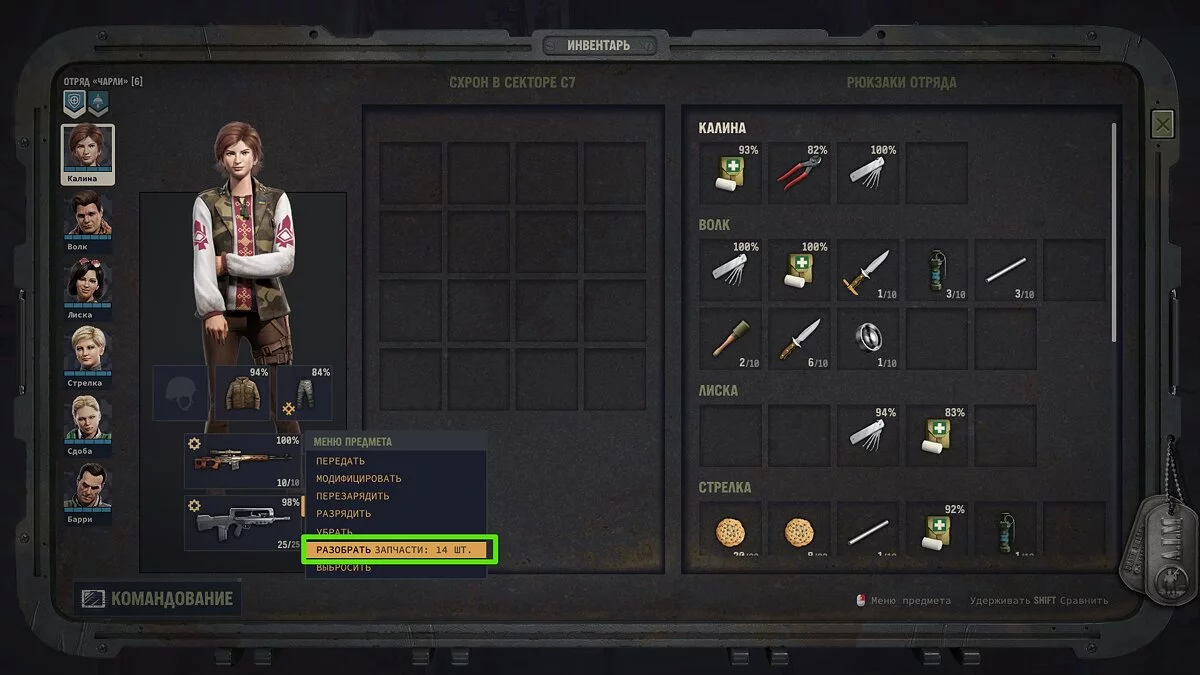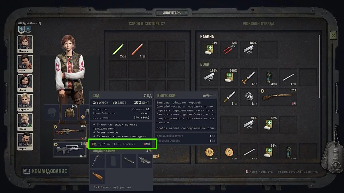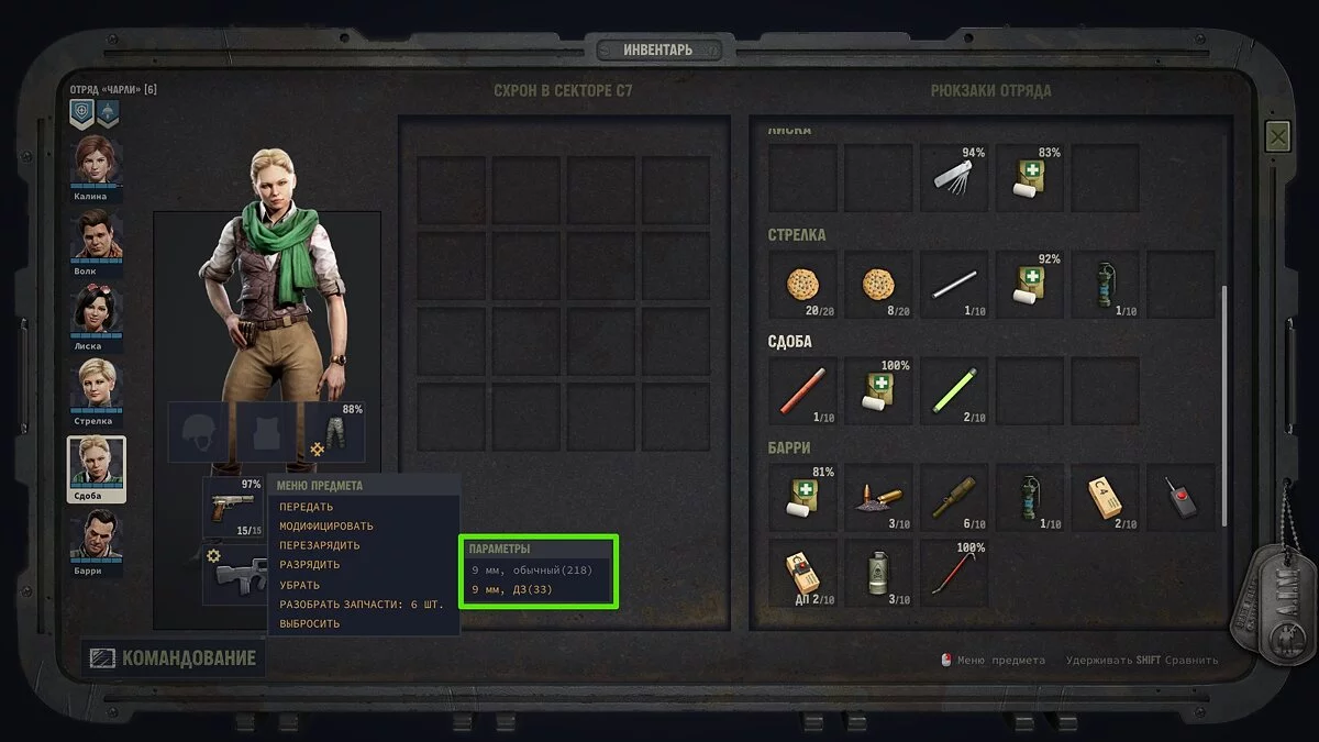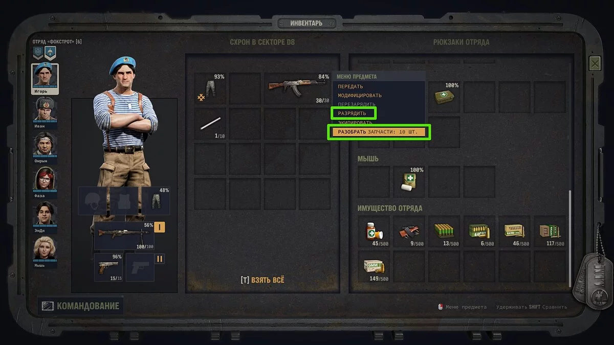 Помимо этого, по мере исследования локаций и шахт вы будете находить схроны с различными пушками, которые будут заряжены патронами своего калибра. Даже если вы не желаете оставлять оружие, просто разберите его — содержимое обоймы автоматически отправится к вам в инвентарь, в раздел «Имущество отряда».
