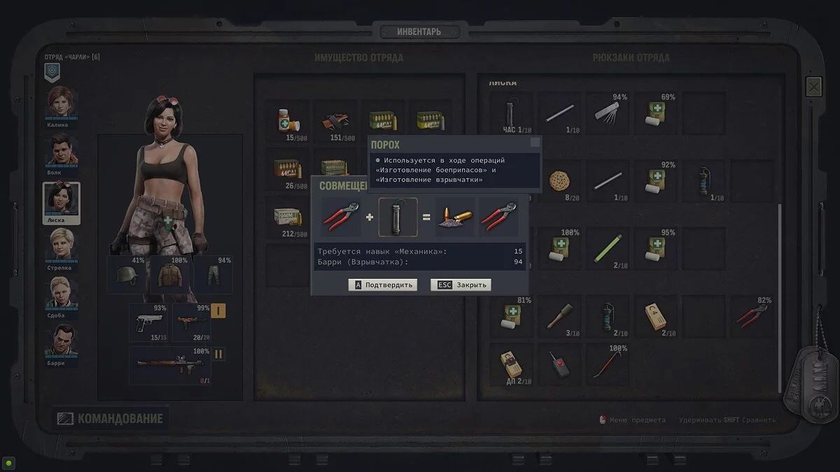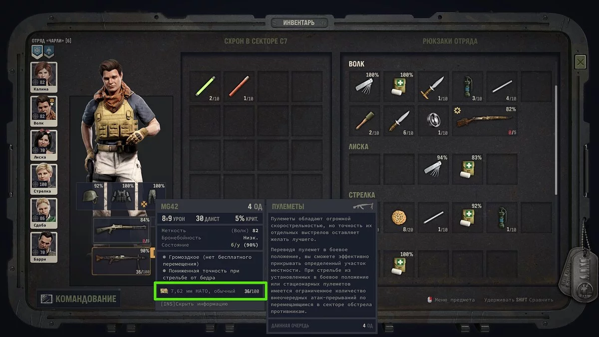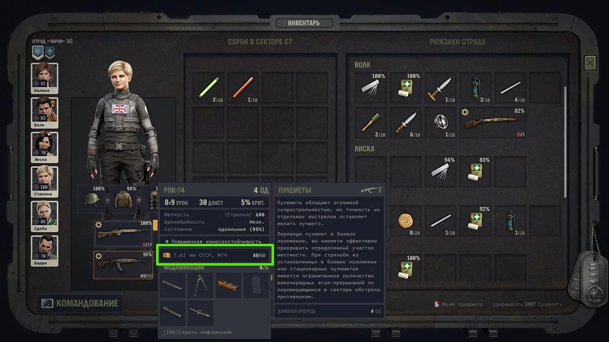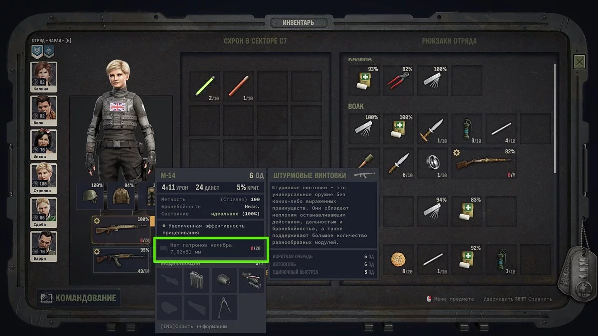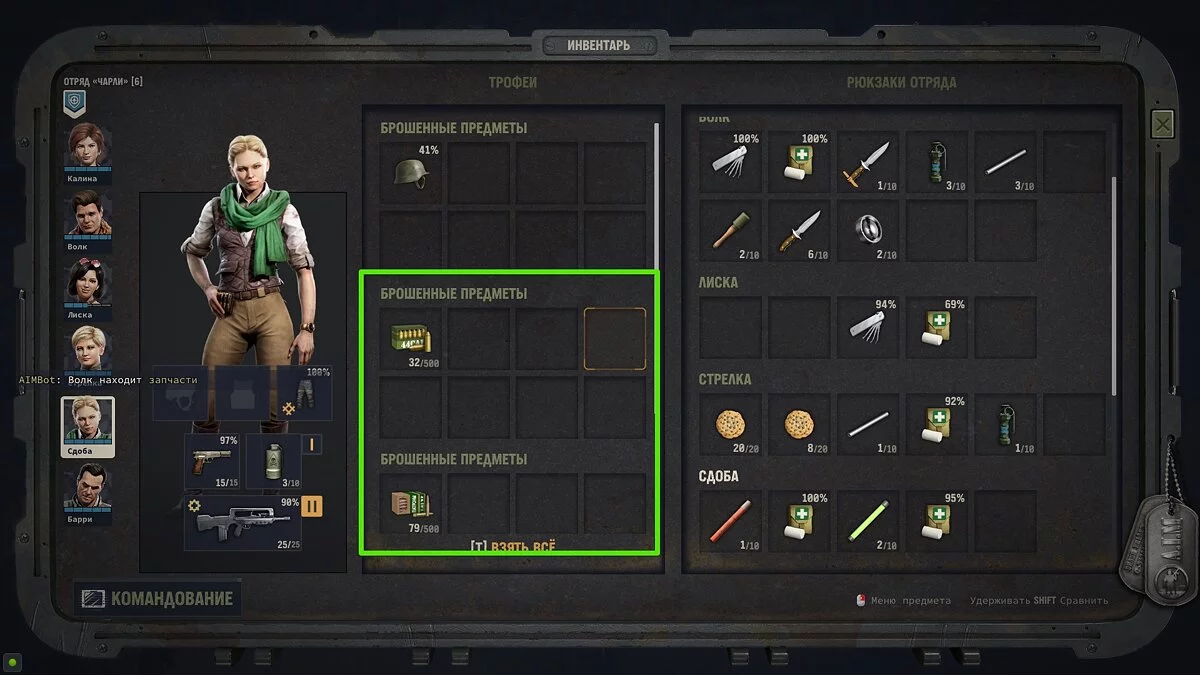 Помимо этого, по мере исследования локаций и шахт вы будете находить схроны с различными пушками, которые будут заряжены патронами своего калибра. Даже если вы не желаете оставлять оружие, просто разберите его — содержимое обоймы автоматически отправится к вам в инвентарь, в раздел «Имущество отряда».