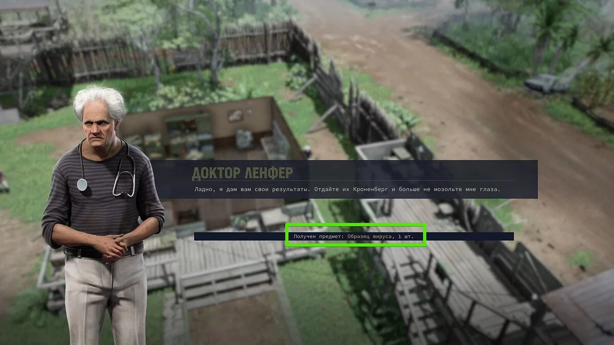 Далее игроку предоставляется выбор: дать врачу возможность продолжить эксперименты, приказать ей немедленно остановится или просто убить доктора. Последний вариант вводит дополнительное условие: собрать образцы за 10 дней. В других случаях ограничений не будет. А если ступите на кровавый путь, то увы, квест закончится.