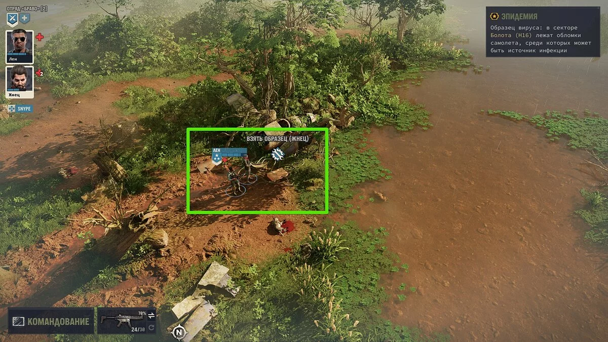 Эта локация кишит гиенами и крокодилами. Первые очень быстрые и смертоносные, а вторые имеют очень высокий показатель брони. На карте нет мирных жителей, поэтому не стесняйтесь пользоваться взрывчаткой. Как только вы разберетесь с местным зоопарком, отправляйтесь к обломкам самолета. Здесь вы найдете чемодан с образцом. Чтобы его открыть, вам потребуется 80 очков навыка «механика».