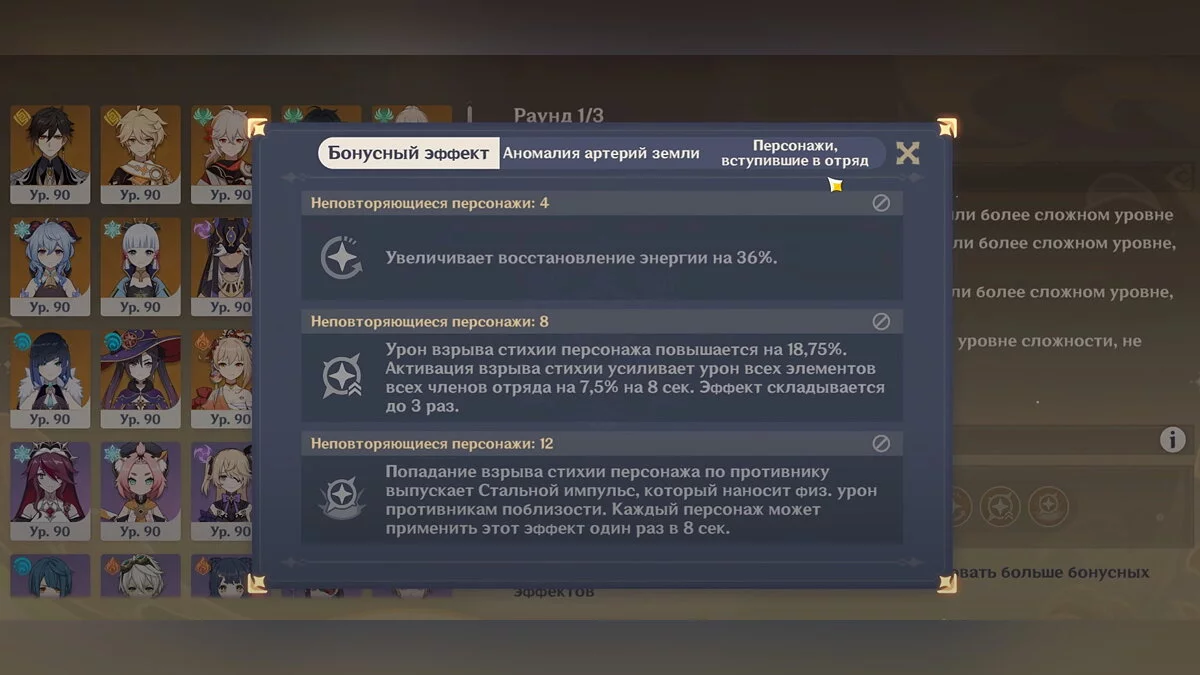 1-й раунд. Вам нужно будет одолеть Гидро-противников. Имейте ввиду, что они имеют высокое сопротивление этому элементу. Берите в команду персонажей, которые создают реакцию с Гидро. К ним относятся Дендро, Пиро, Электро и Крио-герои. Бонус к восстановлению энергии пригодится всем бойцам.