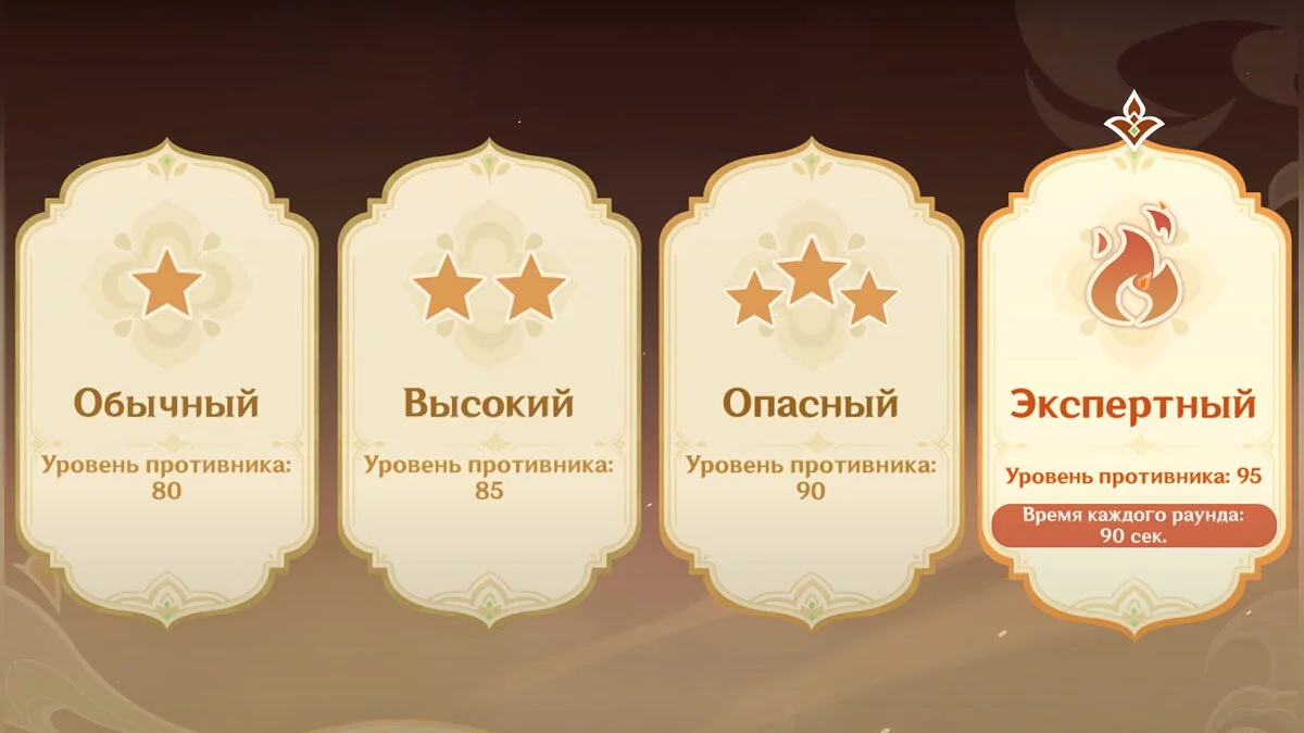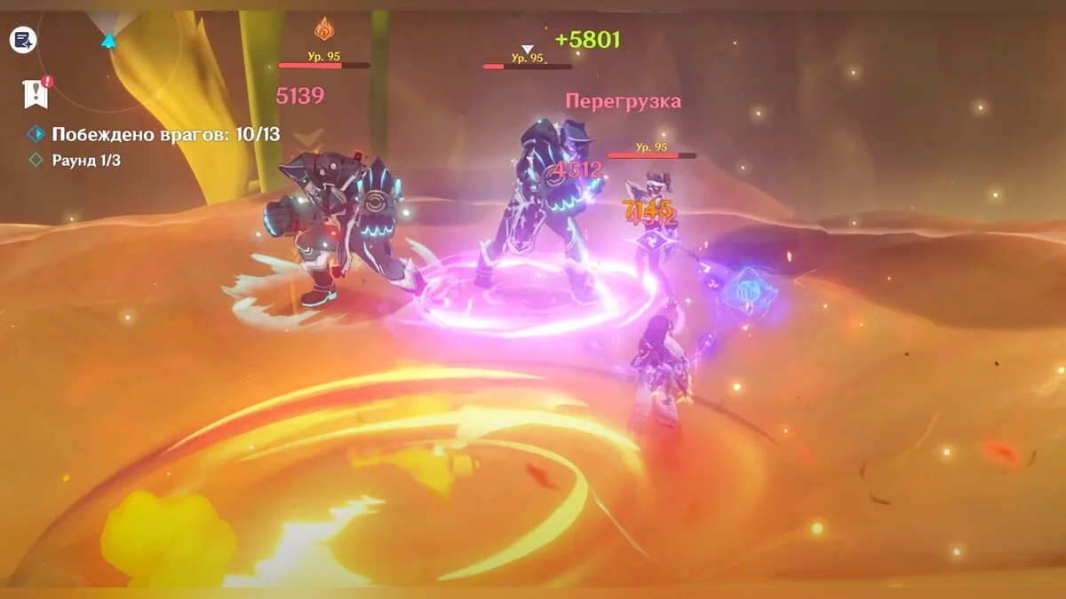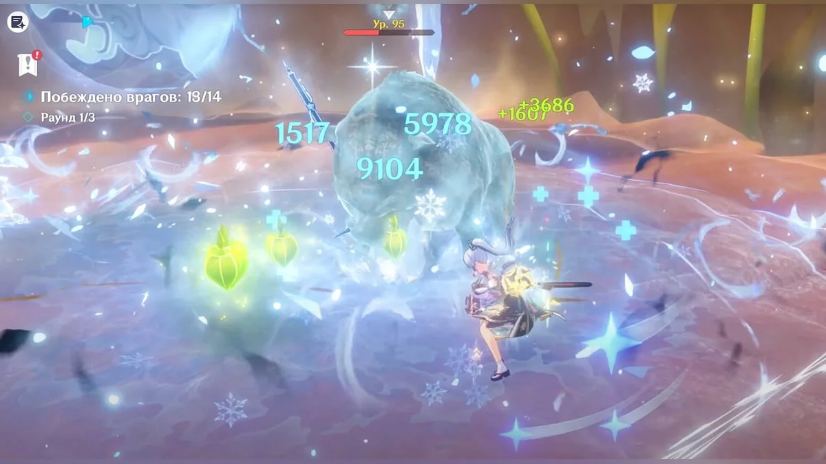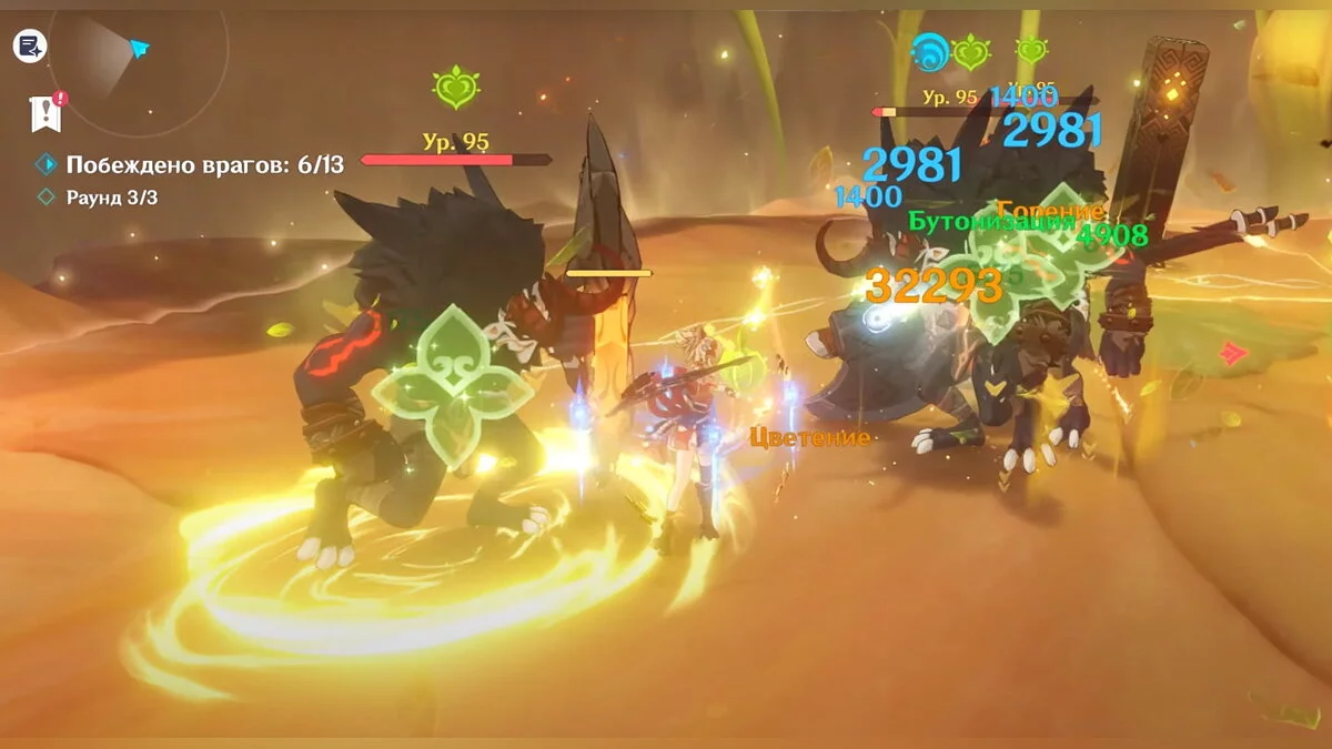 3-й раунд. Необходимо одолеть плесенников, попрыгуний и моровиков различных стихий. Здесь ваша задача — постоянно поддерживать Дендро-реакцию. Бутонизация, которая возникает от взаимодействия с Гидро, не подойдёт, ведь ядра наносят кратковременный урон. Лучше выбрать Пиро-героя и создать реакцию Горения или же Электро-персонажа для Стимуляции, а также Разрастания и Обострения. Подробнее обо всех реакциях вы можете узнать из нашего гайда.
