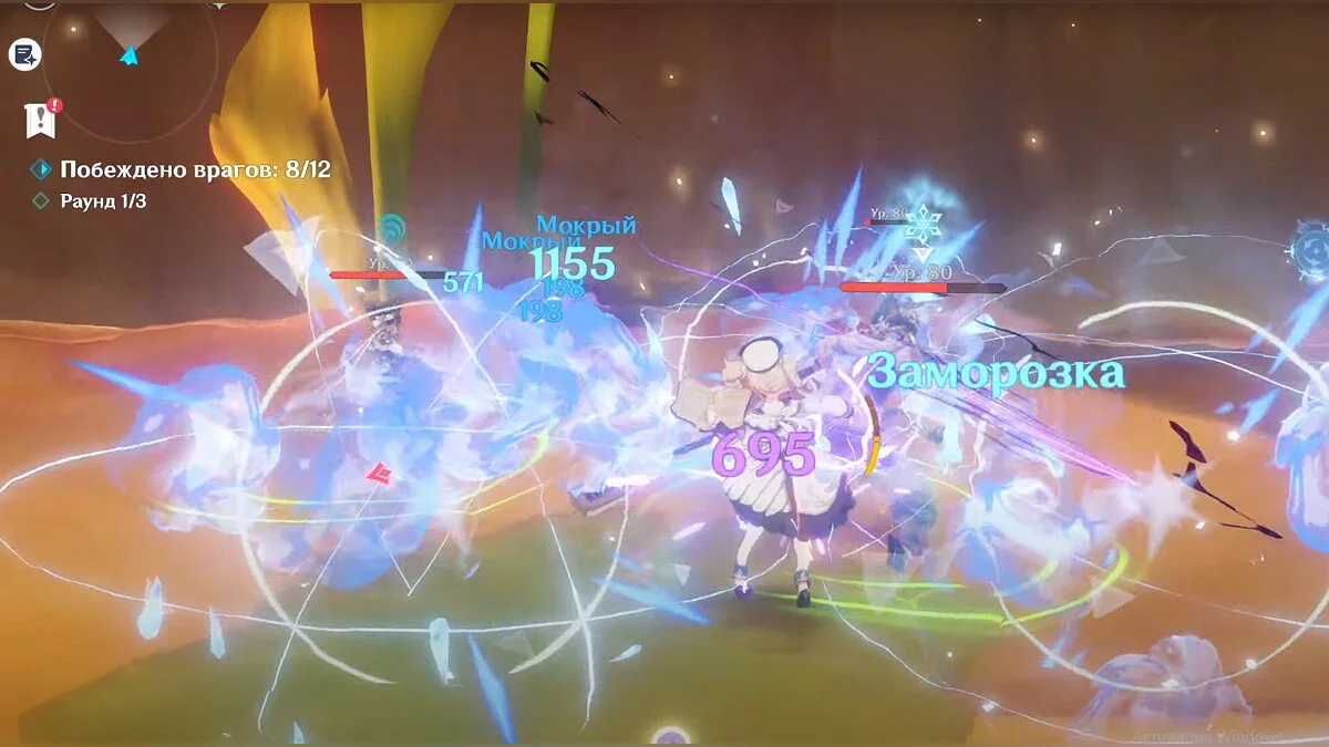- 8 разных героев: защита врагов снижается на 40% в течение 6 секунд, когда вы вызываете реакцию Рассеивание. Она возникает при сочетании Анемо с Пиро, Крио, Гидро или Электро. Бонус работает во втором и третьем раундах;