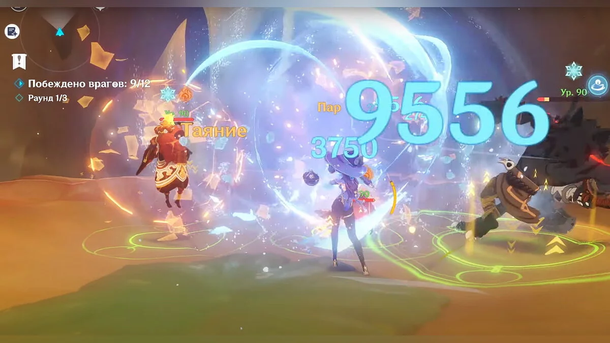 - 12 разных персонажей: пока противник находится под действием Дендро-реакции, все враги 1 раз в 3 секунды получают физический урон. Действует только в третьем раунде.