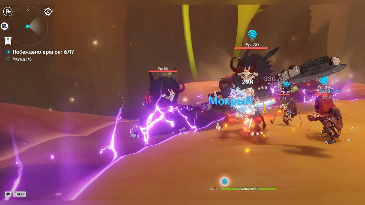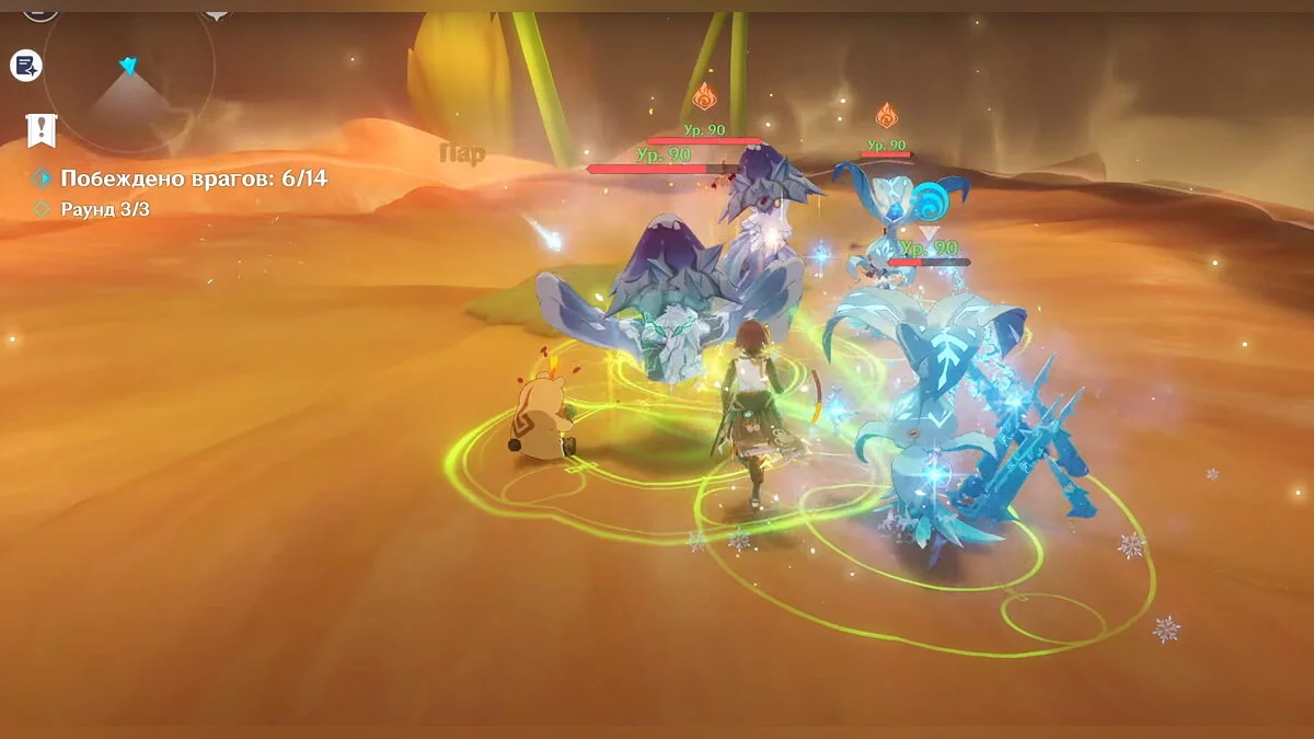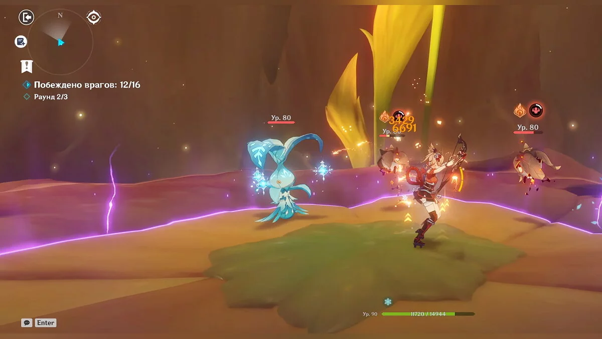 1-й раунд. В качестве противников будут выступать различные пустынники. Среди них будет Охотница ветров и Зачарователь камней. Рекомендуем брать в команду тех бойцов, которые наносят урон по площади. К ним относятся Аяка, Тарталья, Гань Юй и Сёгун Райден.