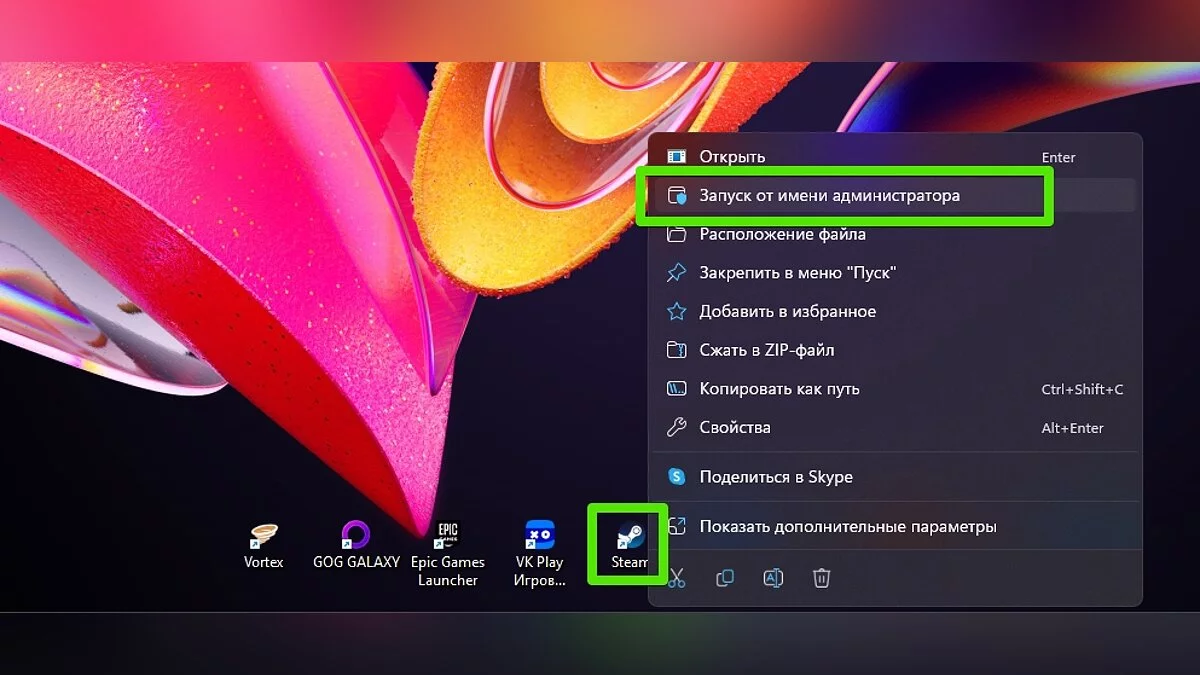 Запуск лаунчера от имени администратора предоставляет приложению дополнительные разрешения, а также может повлиять на возникновение некоторых ошибок. Для этого кликните «ПКМ» по иконке Steam на рабочем столе и выберите «Запуск от имени администратора».