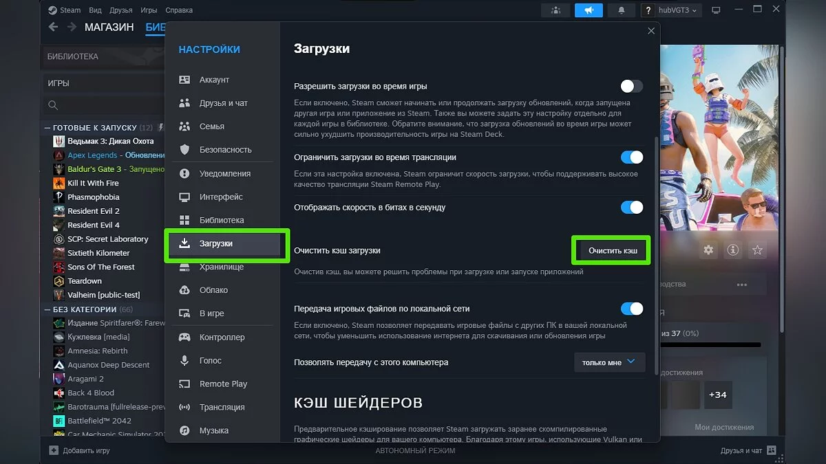 Поврежденный кэш загрузки Steam также может вызвать ошибки записи на диск. Запустите клиент Steam и перейдите по пути: «Steam» — «Настройки» — «Загрузки» — «Очистить кэш загрузки».