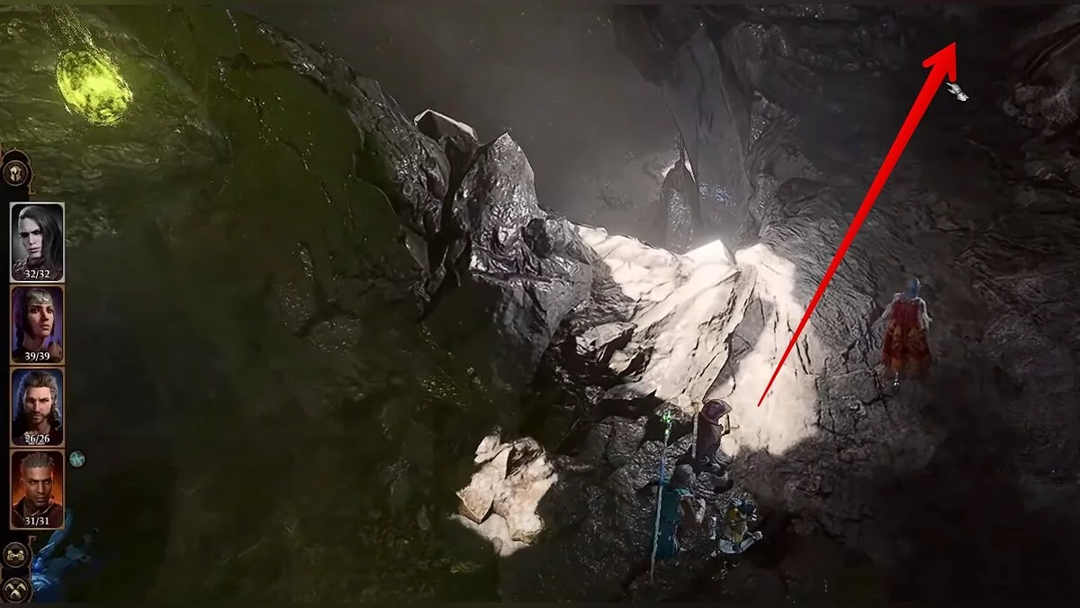 Воспользуйтесь свитком или заклинанием «Падение пера», чтобы избежать урона от падения, и прыгайте вниз. Либо вы можете воспользоваться лианами слева.
