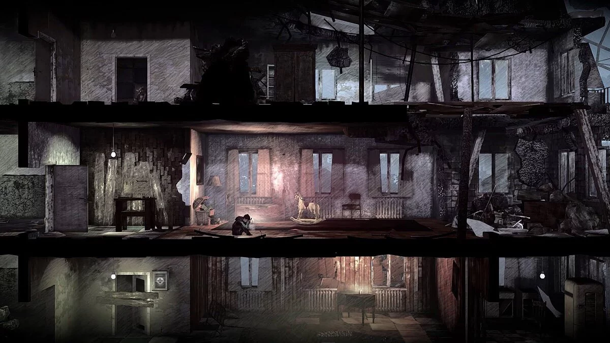 Все это выливается в поистине густую атмосферу и эмоциональное наполнение игрового процесса. Ваш полуразрушенный домик, в котором вы ютитесь, а также остальные постройки, нужно тщательно обыскивать на предмет стройматериалов, еды, снаряжения или даже оружия. Но лопату не смастерить, если не начать разгребать завалы голыми руками. Голодной зимой не выжить, если не начать воровать у мирных и не совсем мирных граждан. Каждый раз, когда ваши выжившие пытаются сделать что-то подобное, This War of Mine превращается в одну из самых мрачных игр декады.