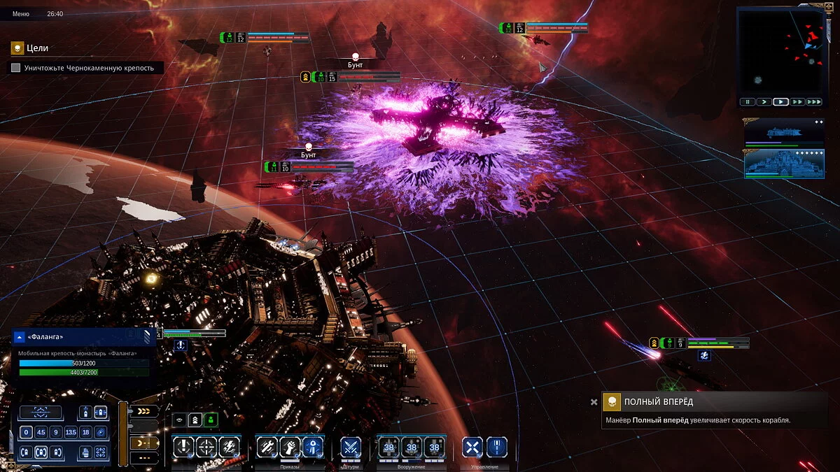 В игре присутствует и Чернокаменная крепость Хаоситов, которую мы разыскивали в оригинале. Она как раз штурмует Кадию, но в ответ из закромов Империума появляется оружие покруче — Фаланга, огромный готический собор, щелкающий флагман главного злодея Аббадона как семечки:
