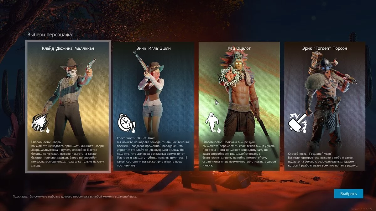 Всего в игре четыре персонажа, и изначально можно использовать только двух. Остальных нужно покупать за внутриигровую валюту, равно как и многочисленные предметы вроде одежды, жестов и эффектов. Кастомизация тут просто безумная: есть как обычные вещи времен Дикого Запада, так и современные трусы и майки, скандинавская броня, кожаные трусы, десятки бредовых шапок и даже рестлерские маски. И странности на этом не заканчиваются.