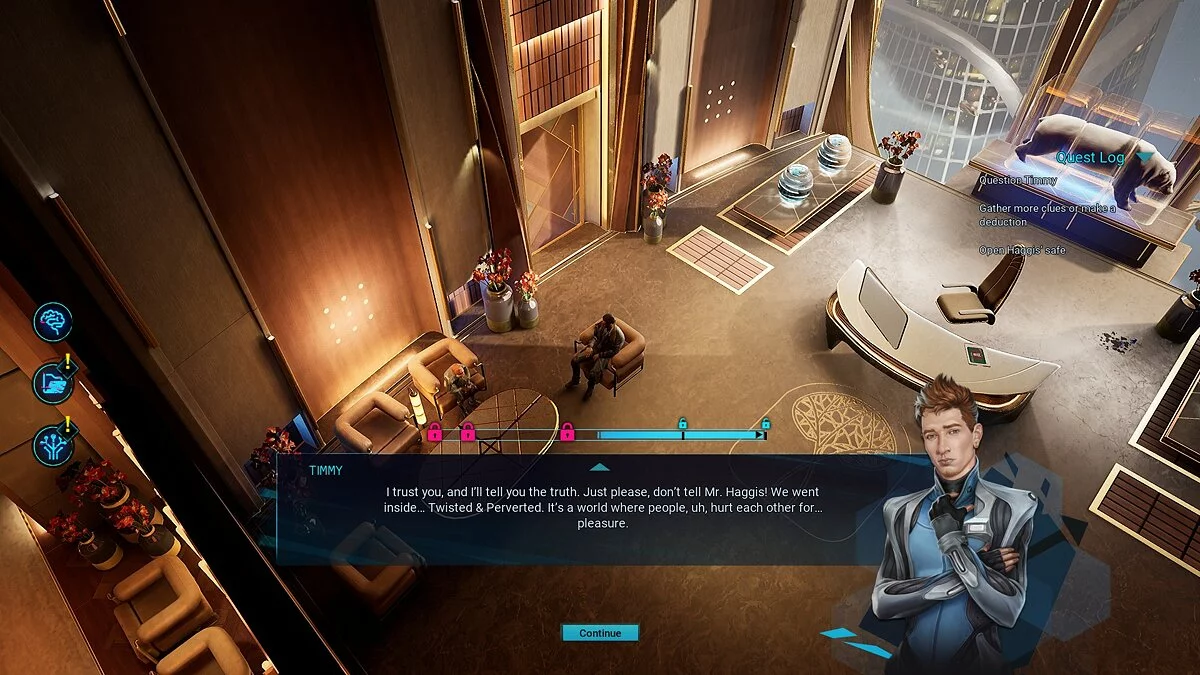 Система любопытная, но есть в ней и недостатки. Чтобы освоить крутые профессии, нужны очки всех типов. Поэтому даже если вы отыгрываете дружелюбного детектива, иногда придётся выходить из роли и дерзить. Не потому, что вы сочли такой ответ наиболее подходящим, а лишь из-за потребности в конкретных очках. Порой это расстраивает.