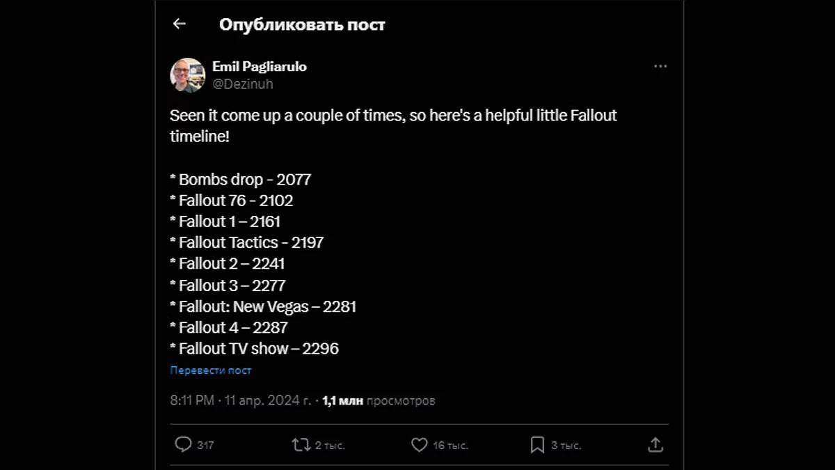 «Видел [обсуждения] пару раз, так что вот вам небольшая хронология Fallout», — написал он в соцсетях, приложив таймлайн всех медиа по этой серии игр.