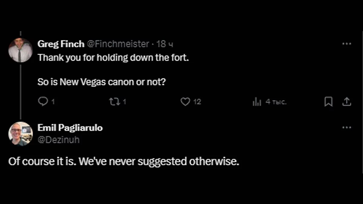 Правда, его пост никак не объяснил, почему после 2277 года Шейди Сэндс все еще существует в Fallout: New Vegas. В ответ на прямой вопрос подписчика, является ли игра каноничной, Эмиль Пальяруло ответил: