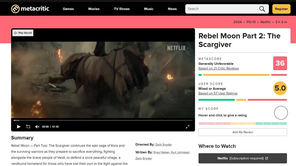 Вторая часть космической оперы Зака Снайдера «Мятежная луна: Дарующая шрамы», представляет собой полусырое завершение хорошо проработанной истории с неубедительными исследованиями персонажей и тусклым действием.