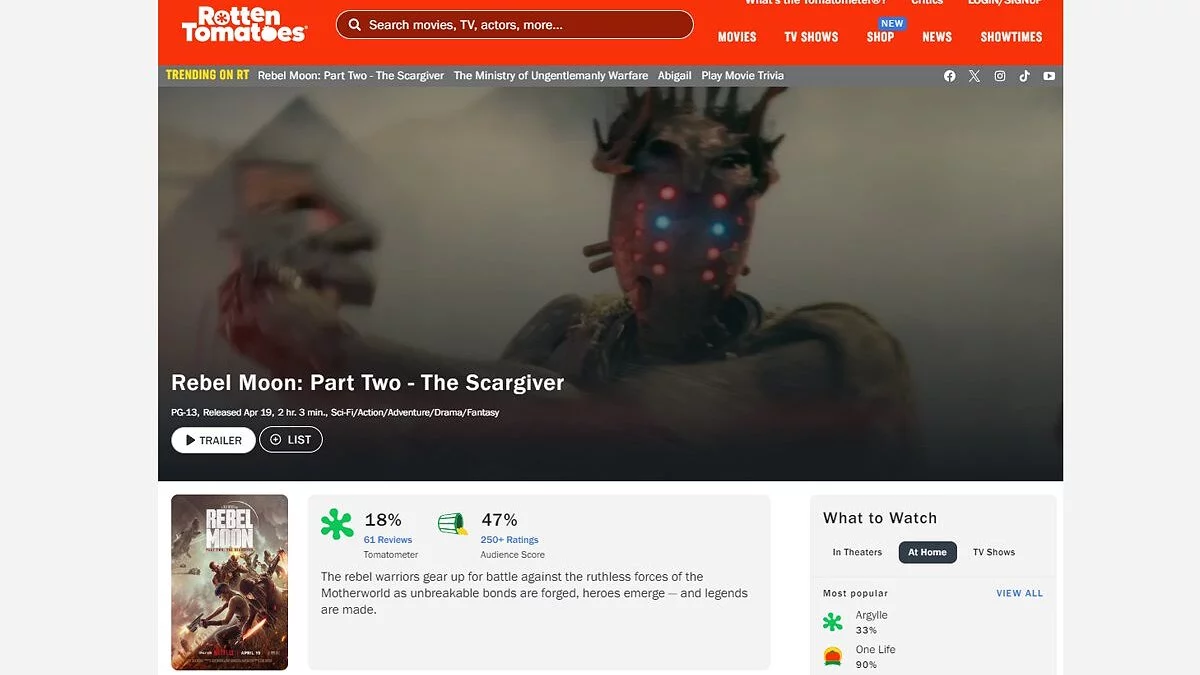 Вчера на Netflix вышло продолжение боевика Зака Снайдера (Zack Snyder) «Мятежная Луна» с подзаголовком «Дарующая шрамы». К главным ролям вернулись София Бутелла (Sofia Boutella), Чарли Ханнэм (Charlie Hunnam), Рэй Фишер (Ray Fisher) и Джимон Хонсу (Djimon Hounsou). Критики выставили крайне низкие оценки фильму — по мнению некоторых, он получился еще хуже, чем первая часть.